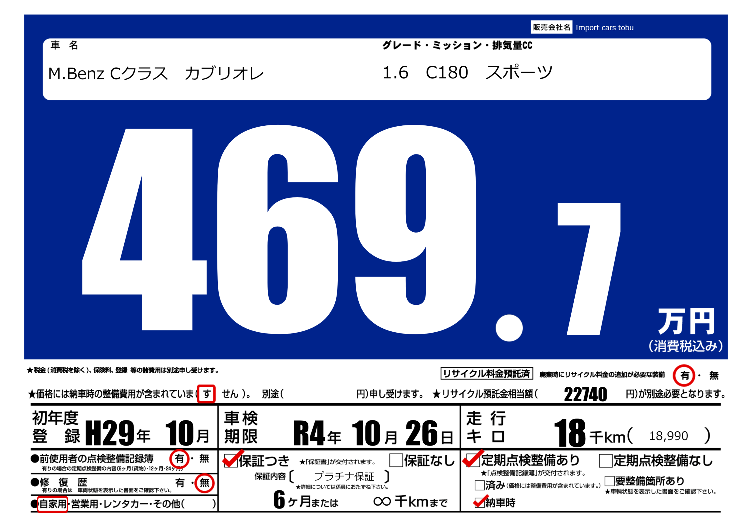 | 車名 | M.Benz Cクラス カブリオレ | グレード ミッション 排気量 |