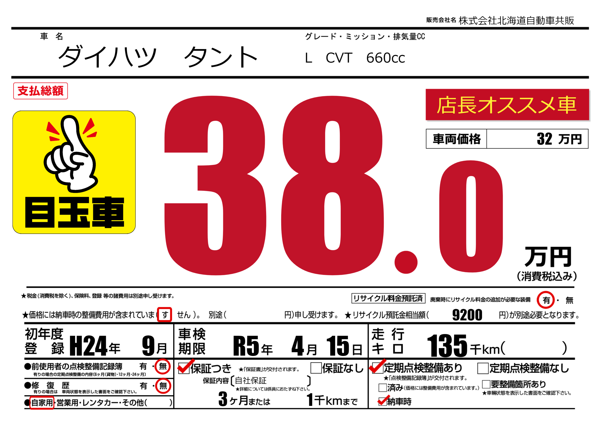 | 車名 | ダイハツ タント | グレード ミッション 排気量 |