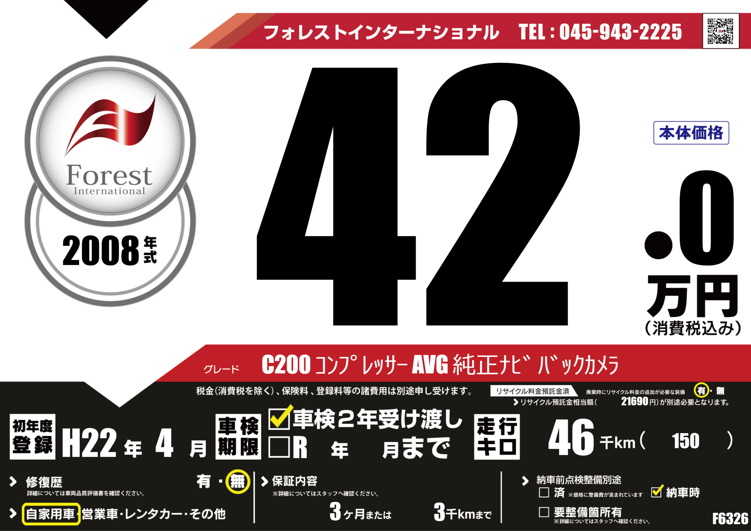 | 走行キロ | 4.6万km | 初年度登録 | H22年4月 |