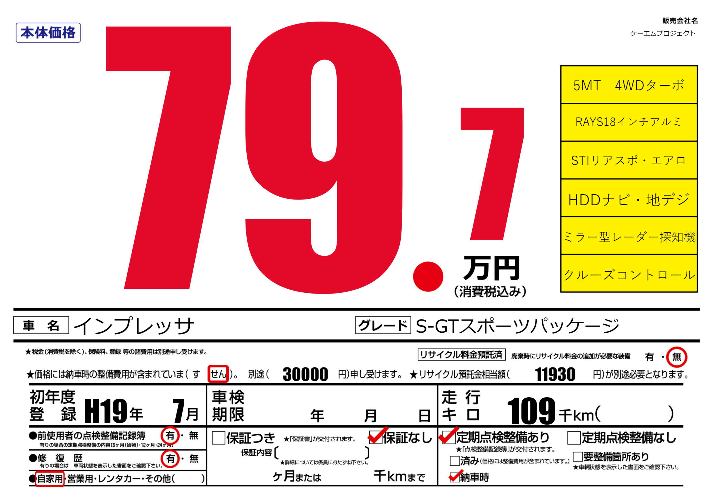 | 車名 | インプレッサ | グレード ミッション 排気量 |