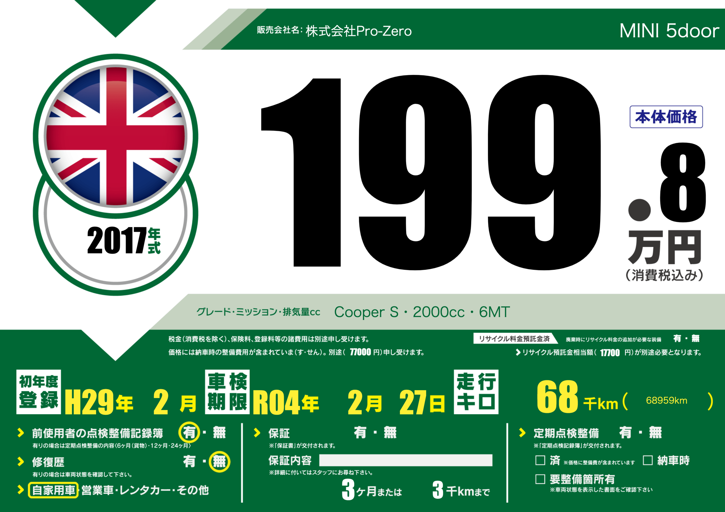 | 車名 | MINI 5door | グレード ミッション 排気量 |