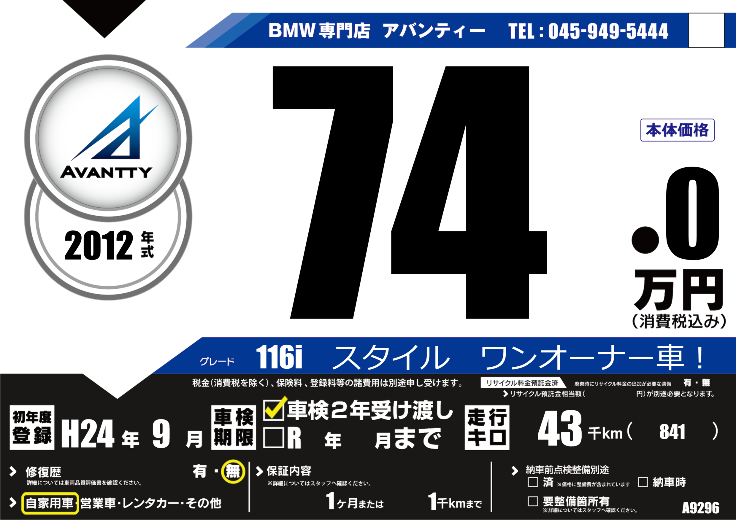 | 走行キロ | 4.3万km | 初年度登録 | H24年9月 |