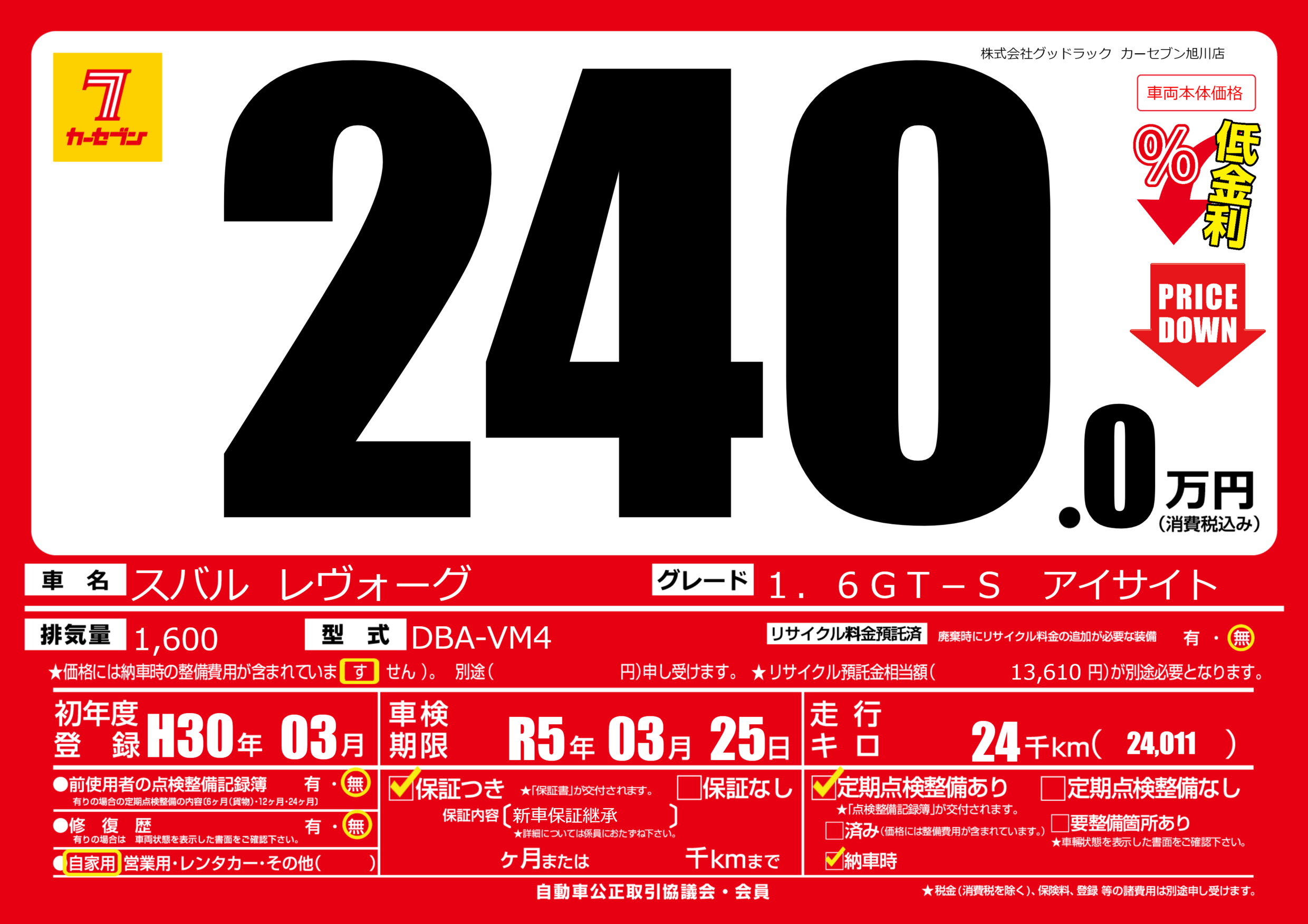 | 車名 | スバル レヴォーグ | グレード ミッション 排気量 |