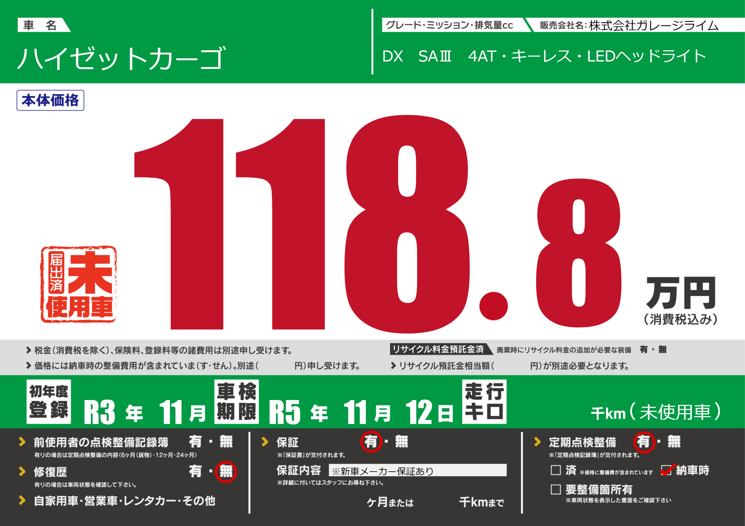 | 車名 | ハイゼットカーゴ | グレード ミッション 排気量 |