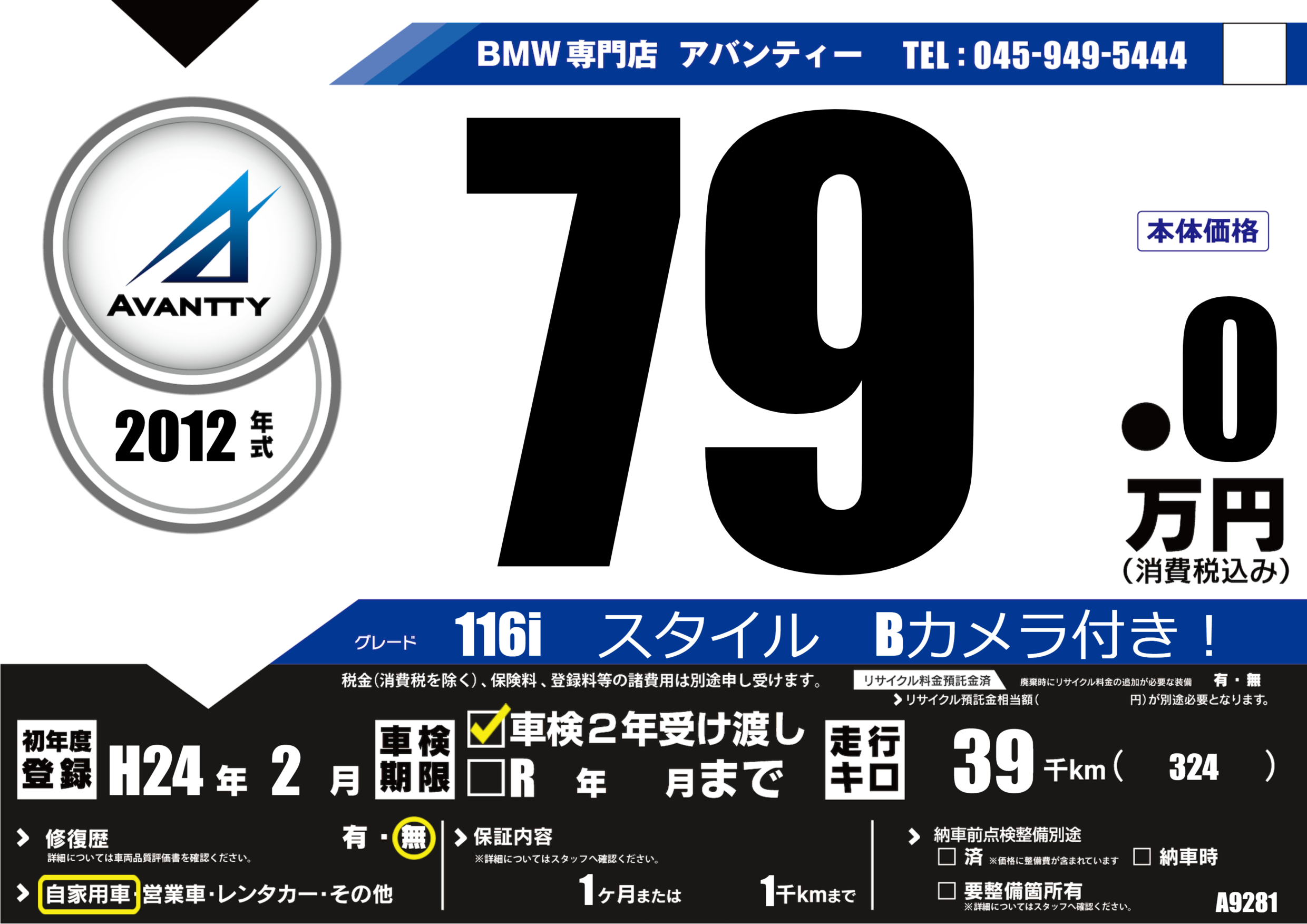 | 走行キロ | 3.9万km | 初年度登録 | H24年2月 |