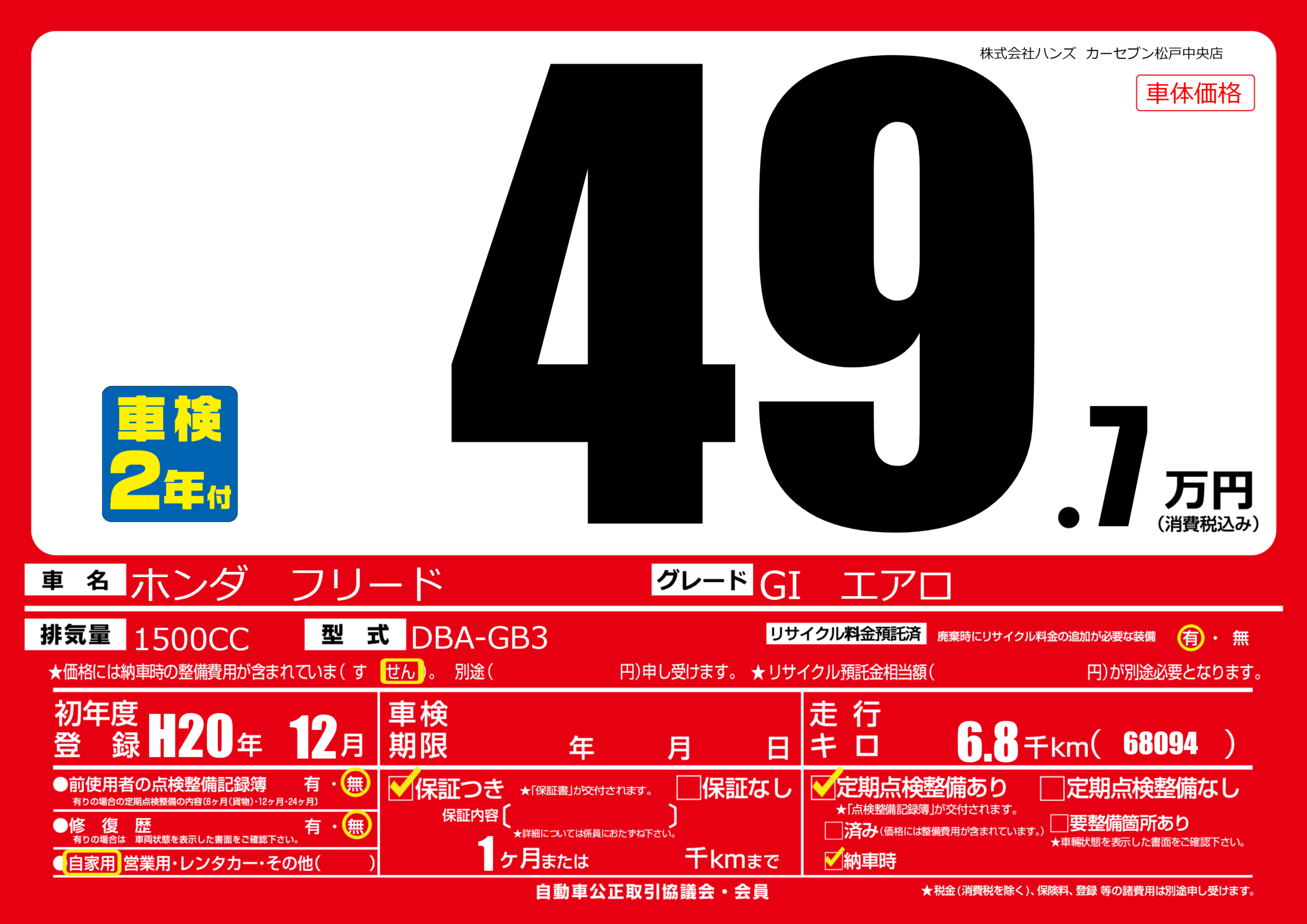 | 車名 | ホンダ フリード | グレード ミッション 排気量 |