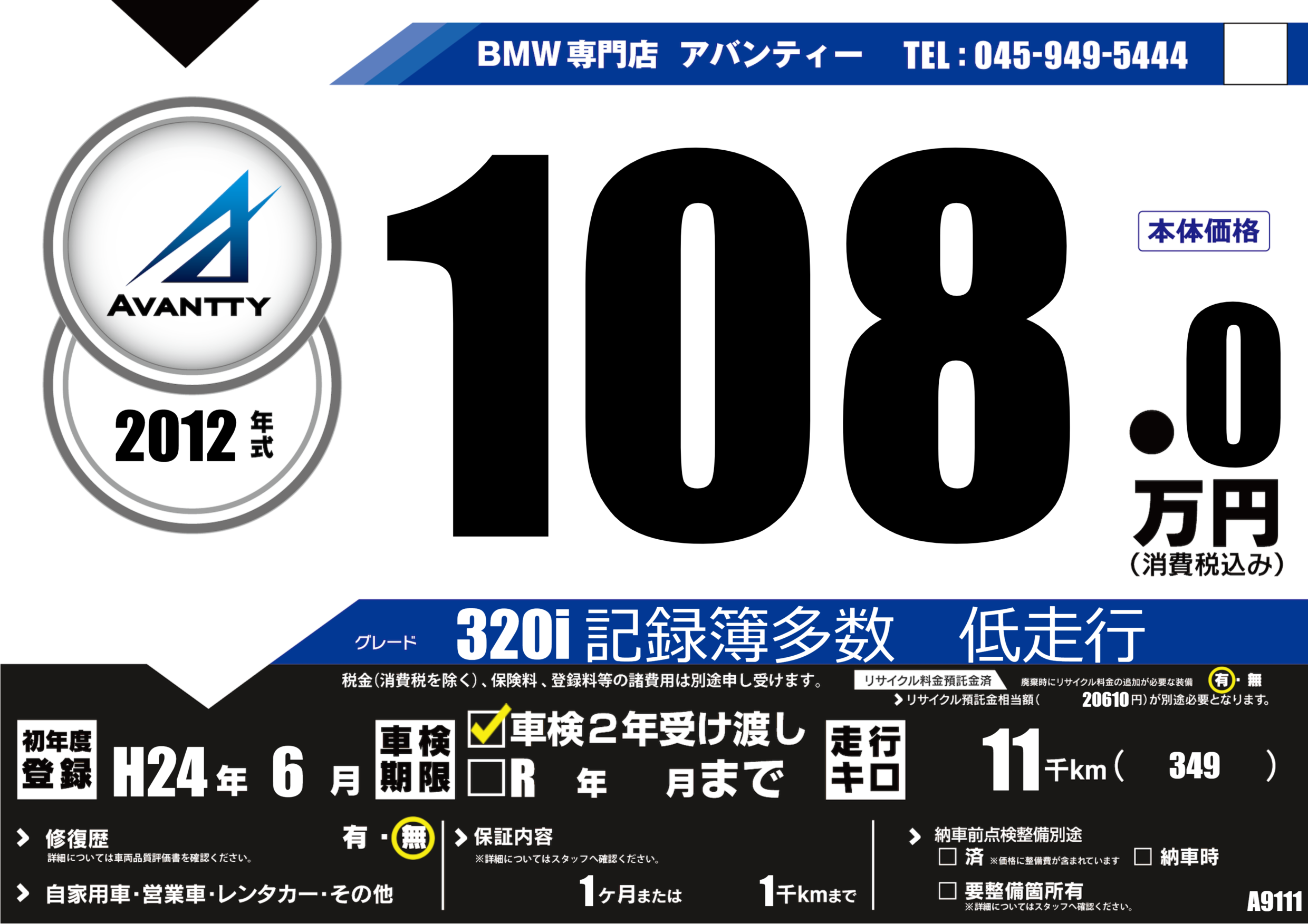 | 走行キロ | 1.1万km | 初年度登録 | H24年6月 |