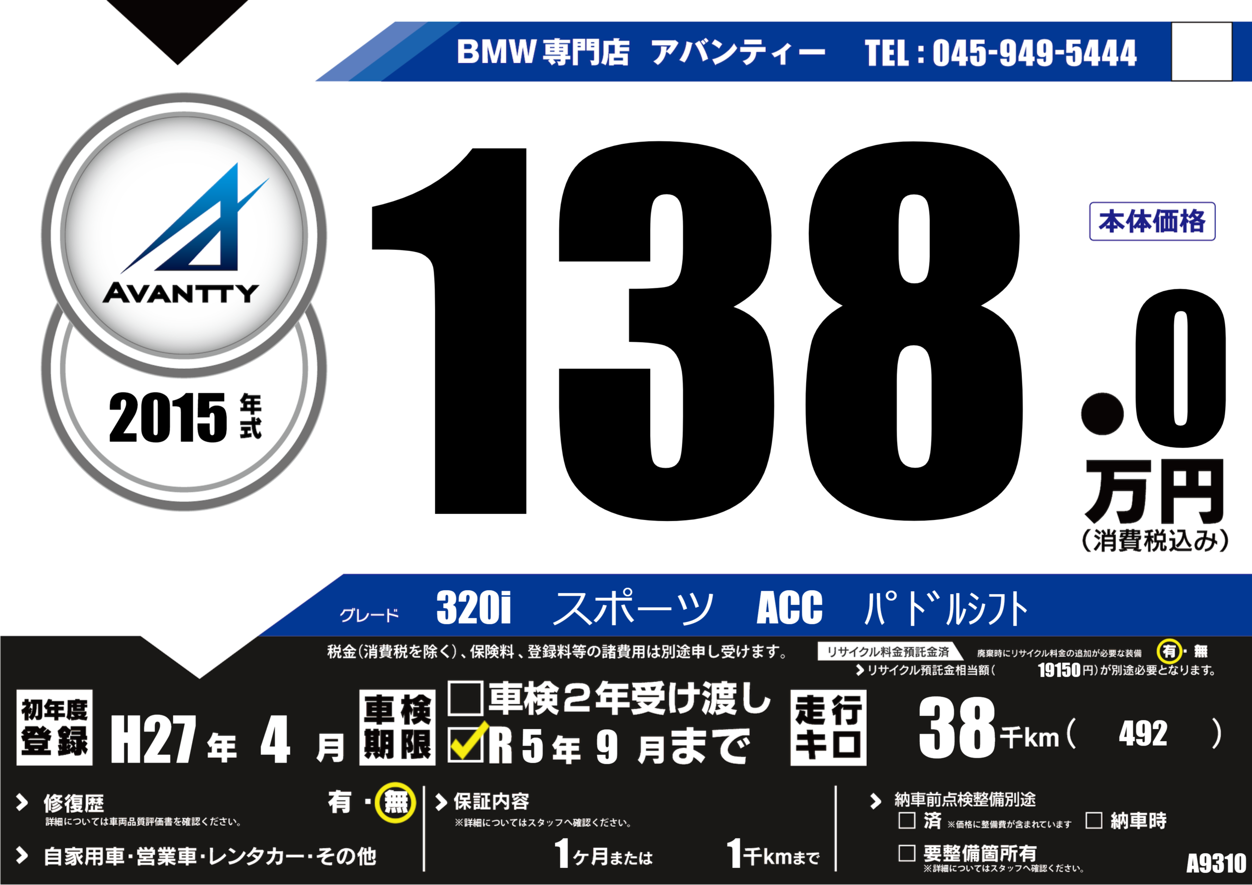 | 走行キロ | 3.8万km | 初年度登録 | H27年4月 |