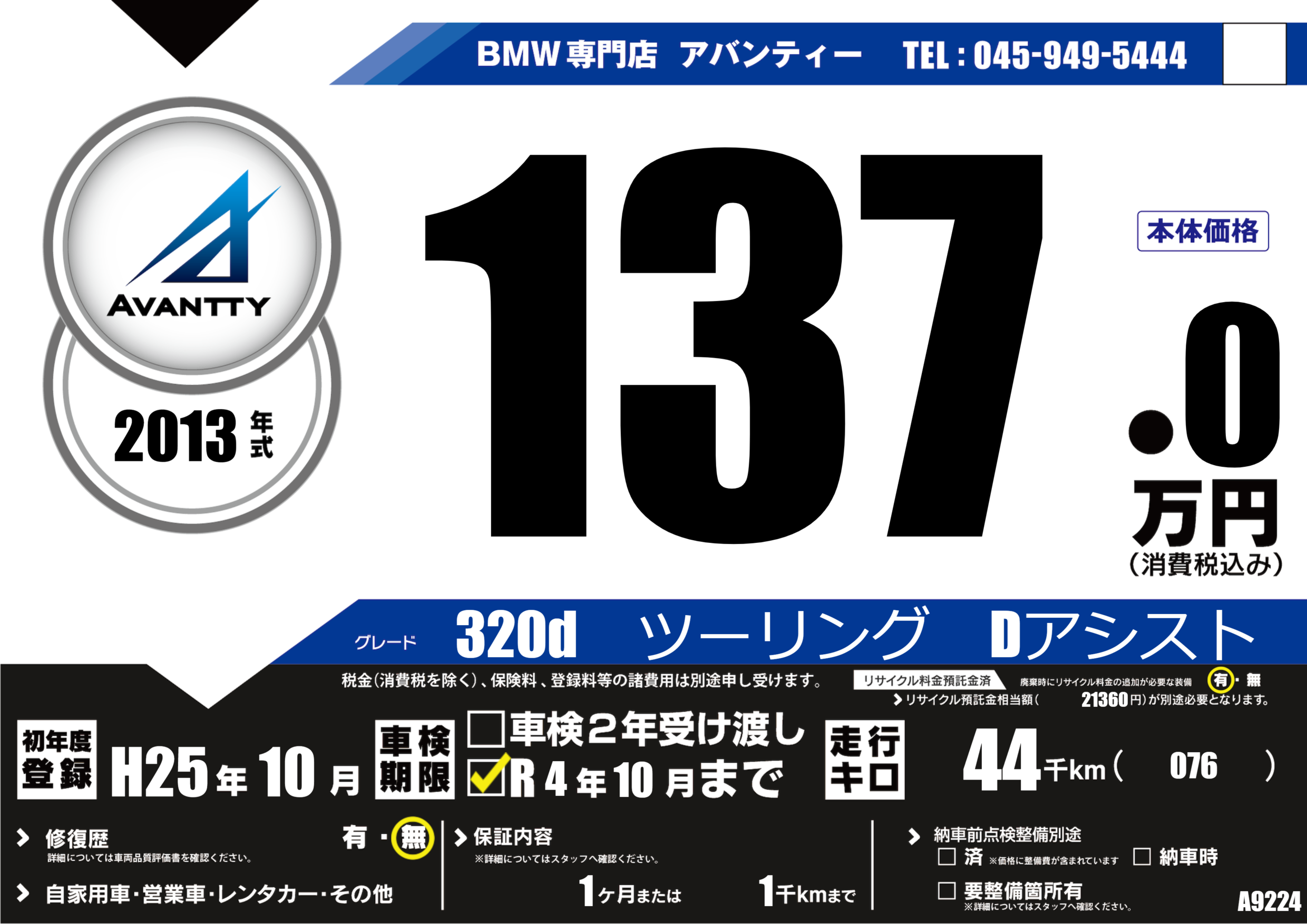 | 走行キロ | 4.4万km | 初年度登録 | H25年10月 |