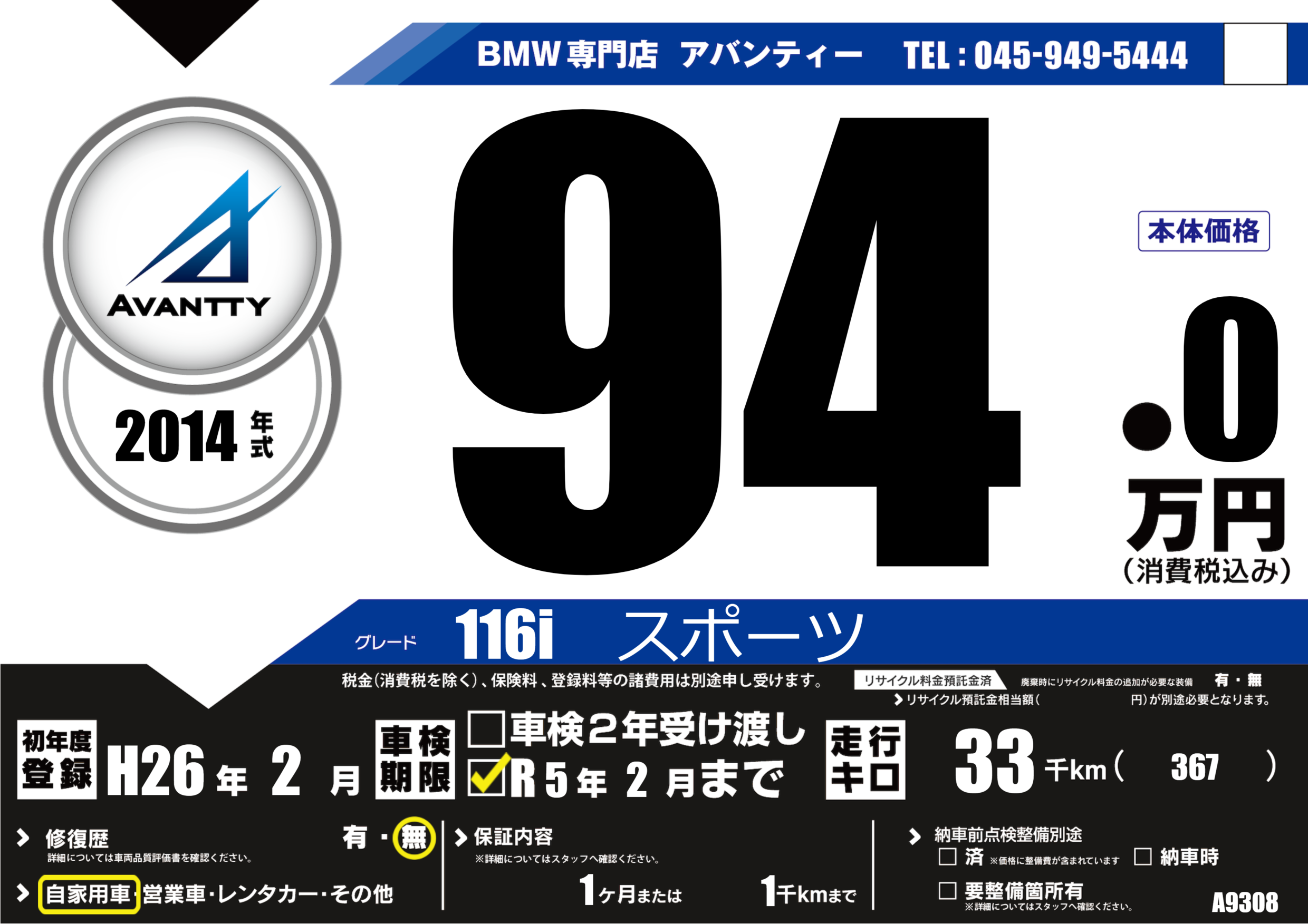 | 走行キロ | 3.3万km | 初年度登録 | H26年2月 |