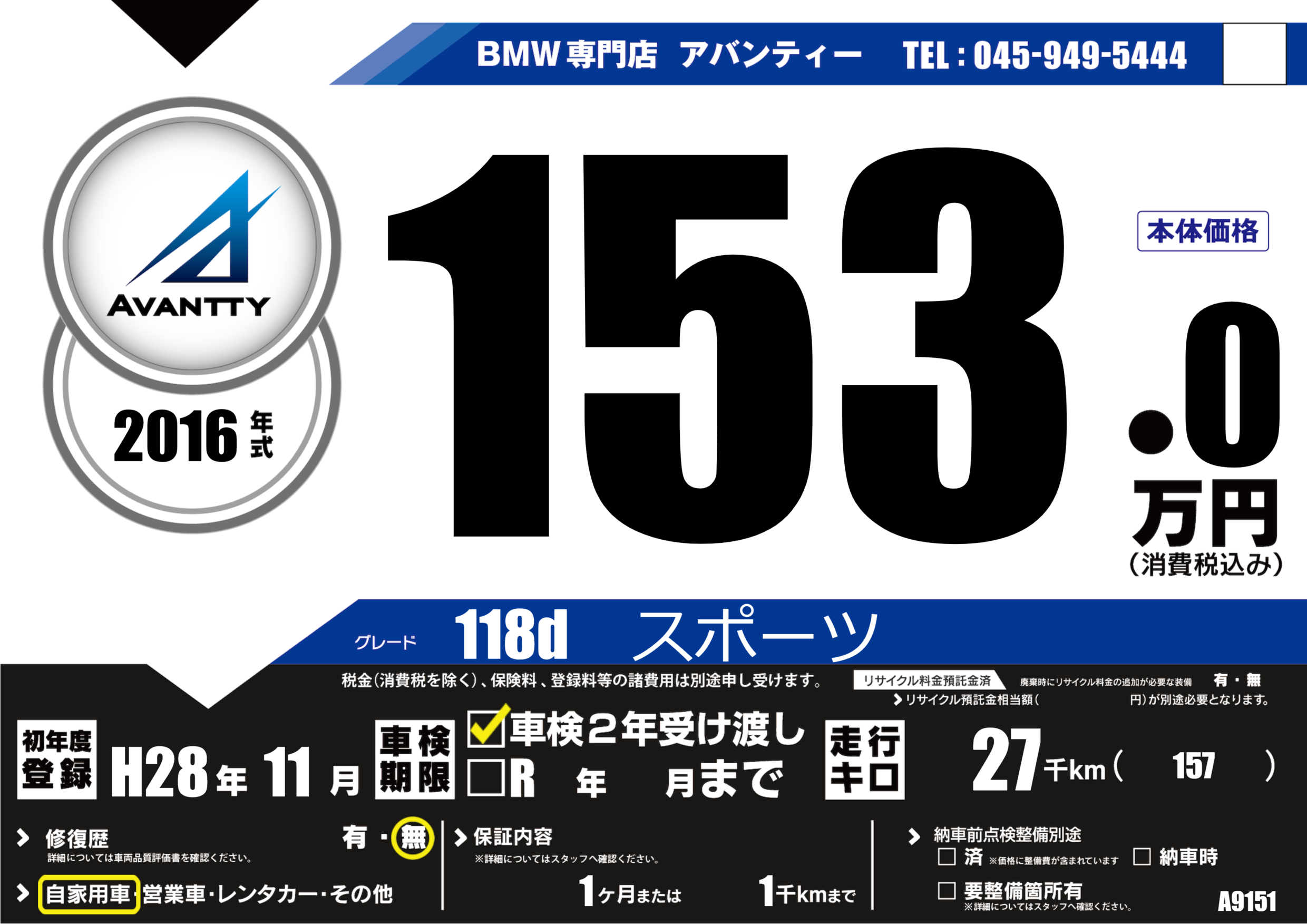 | 走行キロ | 2.7万km | 初年度登録 | H28年11月 |