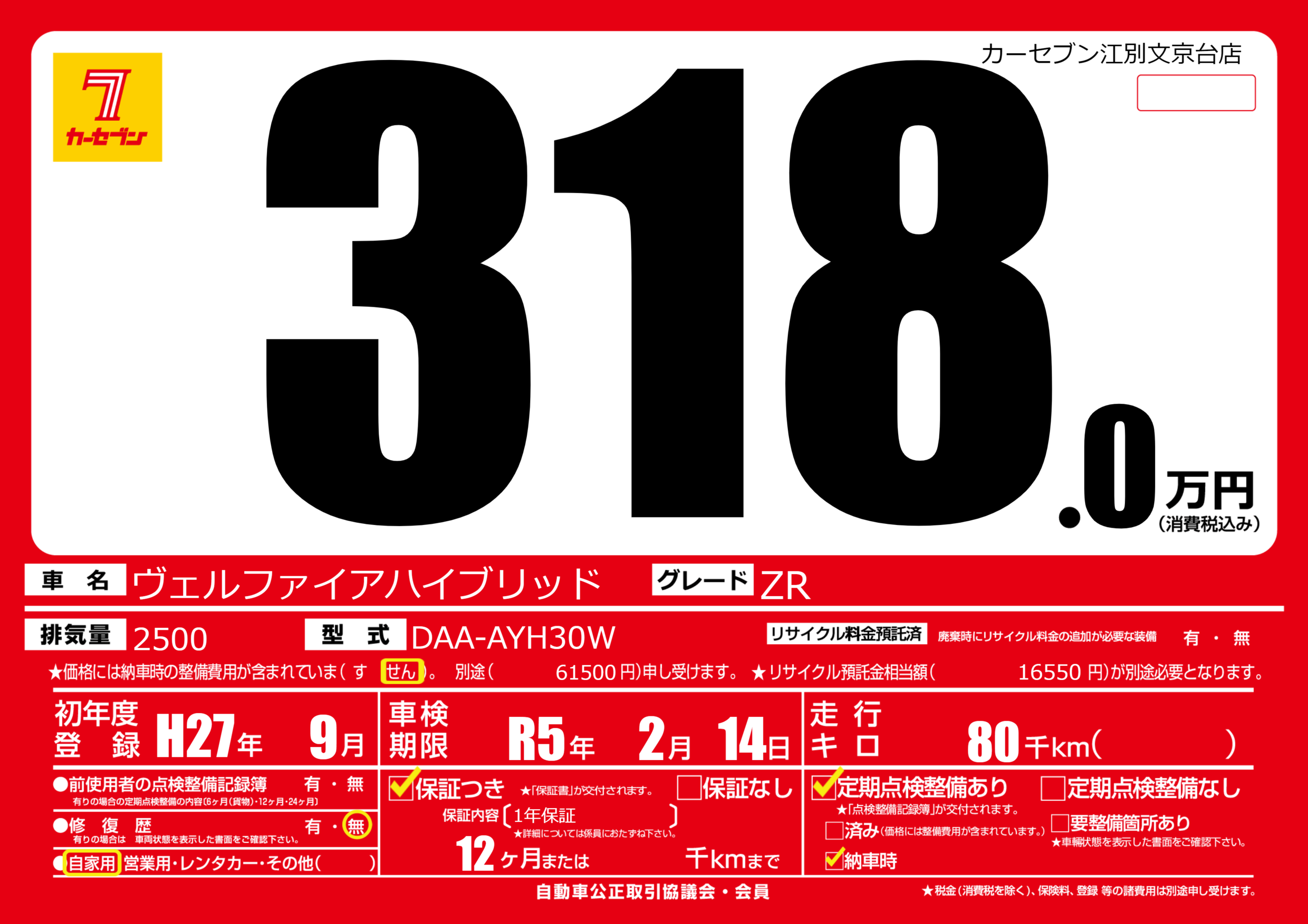 | 車名 | ヴェルファイアハイブリッド | グレード ミッション 排気量 |