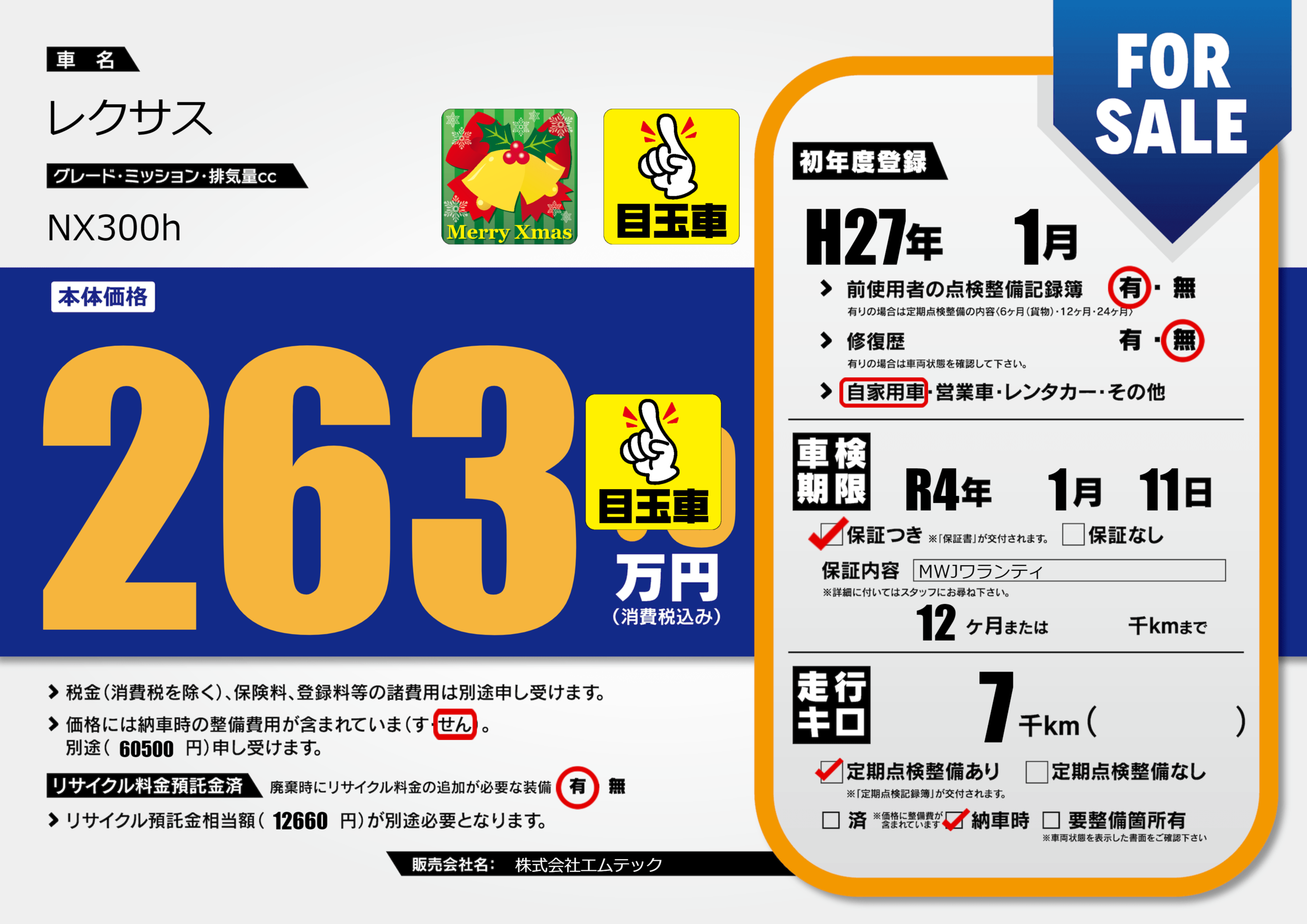 | 定期点検整備 | 定期点検整備あり 納車時あり | ||