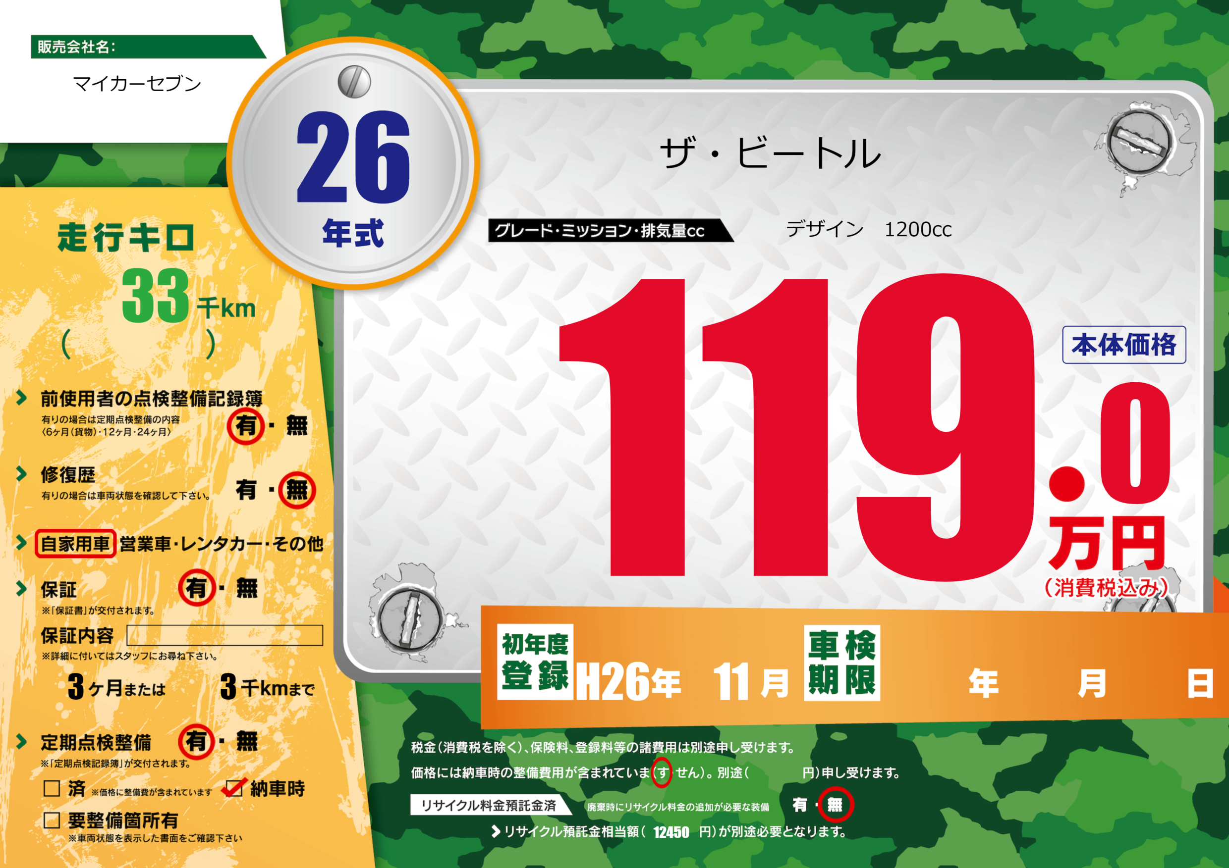 | 車名 | ザ・ビートル | グレード ミッション 排気量 |