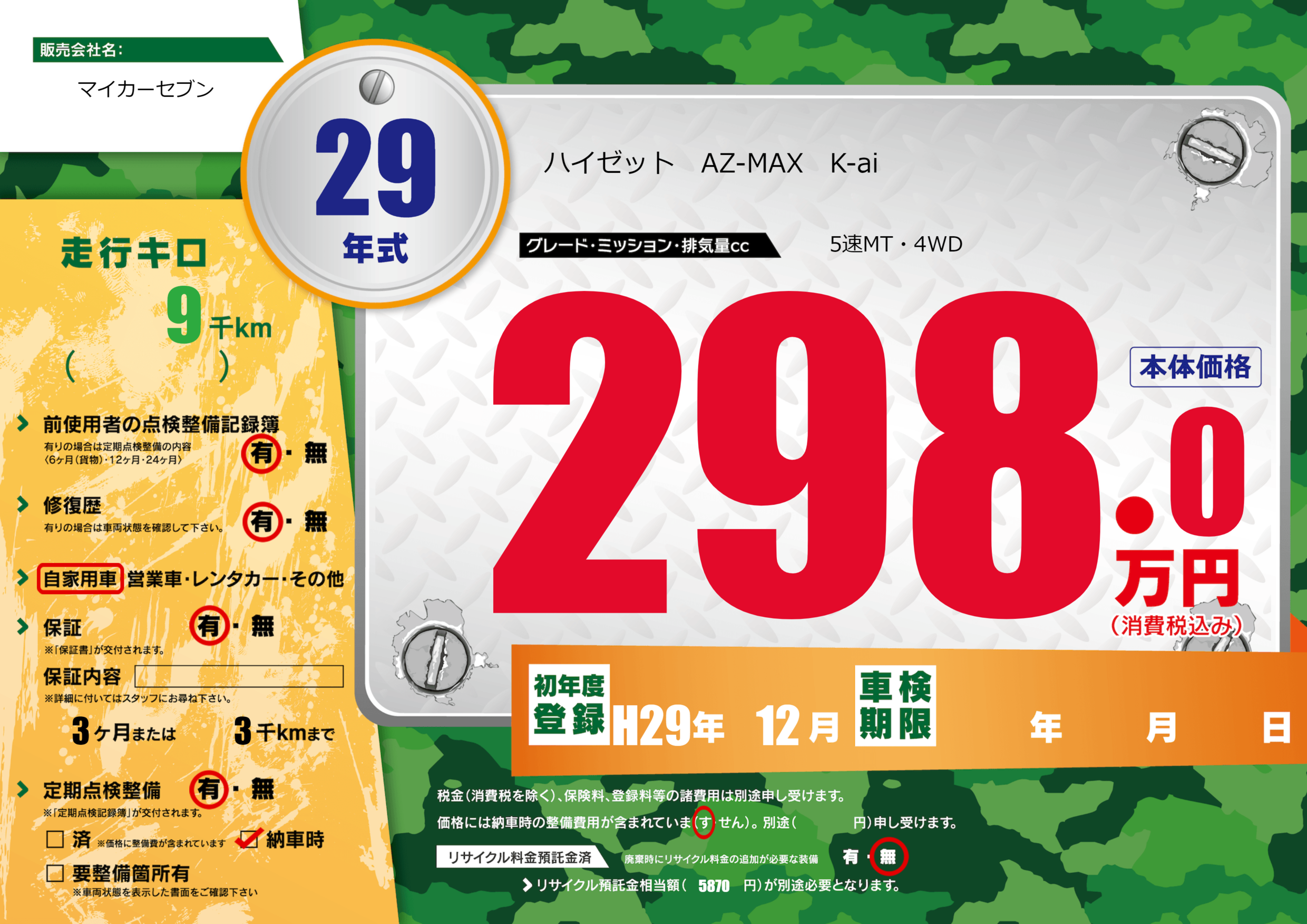 | 車名 | ハイゼット AZ-MAX K-ai | グレード ミッション 排気量 |