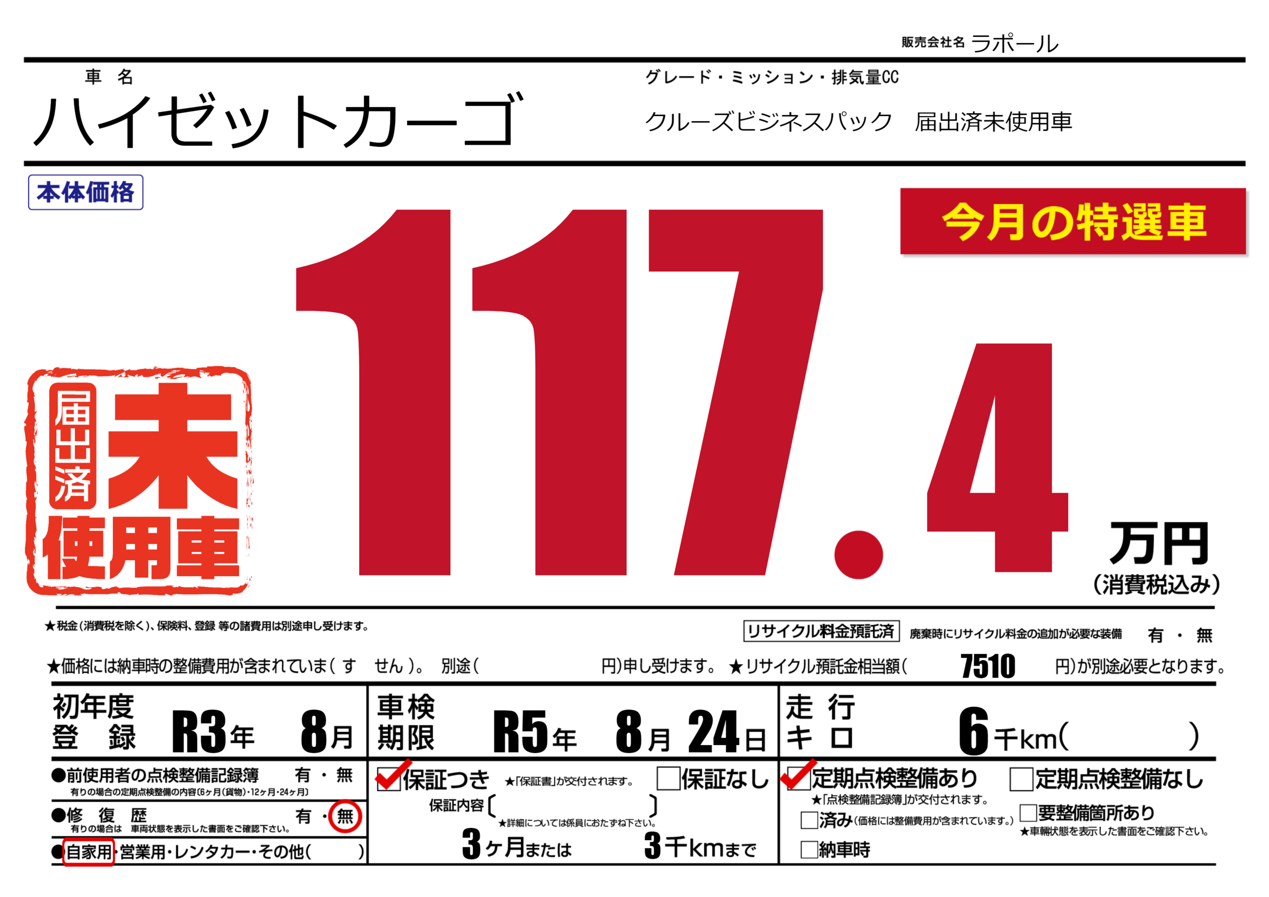 | 走行キロ | 0.6万km | 初年度登録 | R3年8月 |