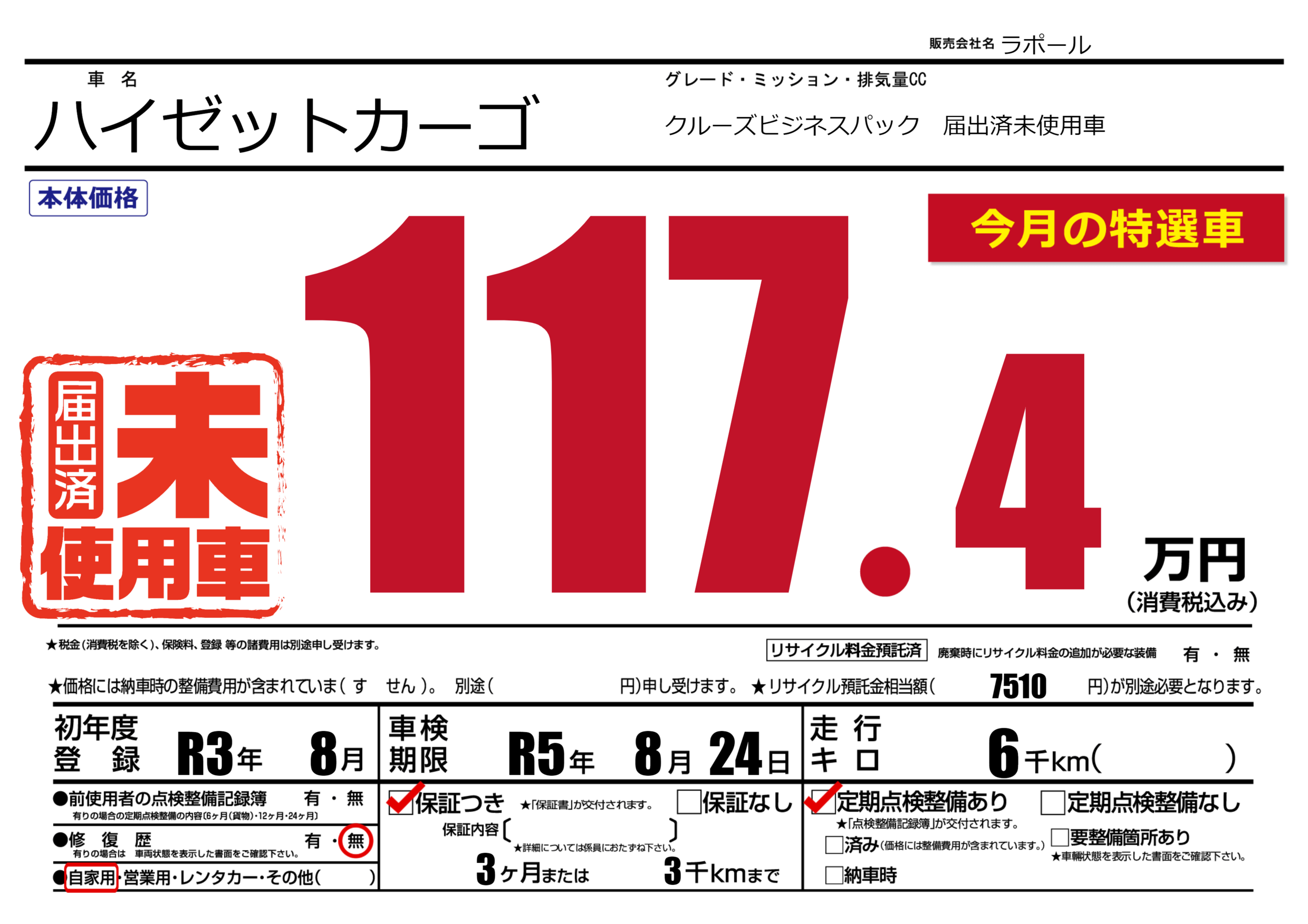 | 走行キロ | 0.6万km | 初年度登録 | R3年8月 |