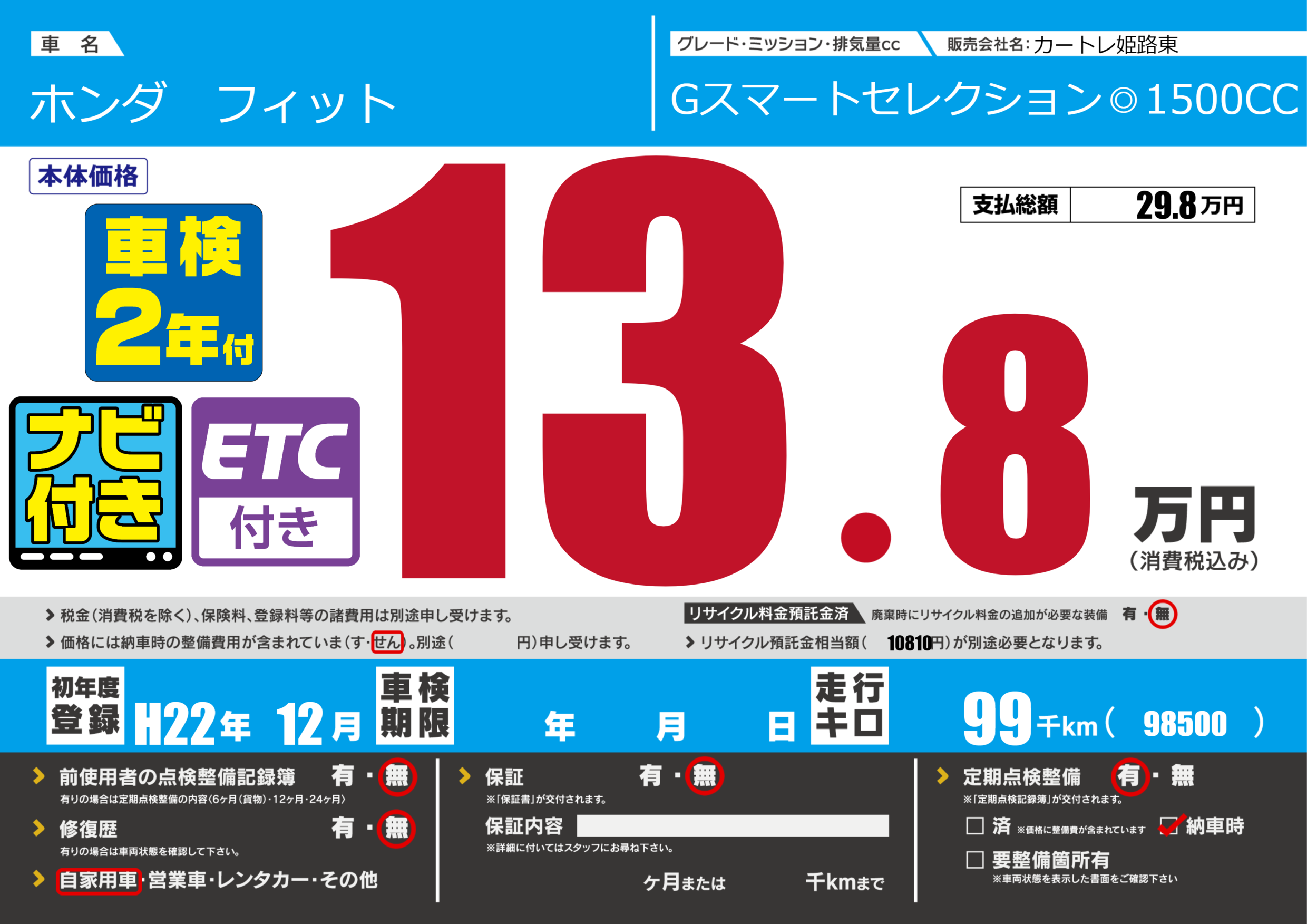 | 走行キロ | 9.9万km | 初年度登録 | H22年12月 |