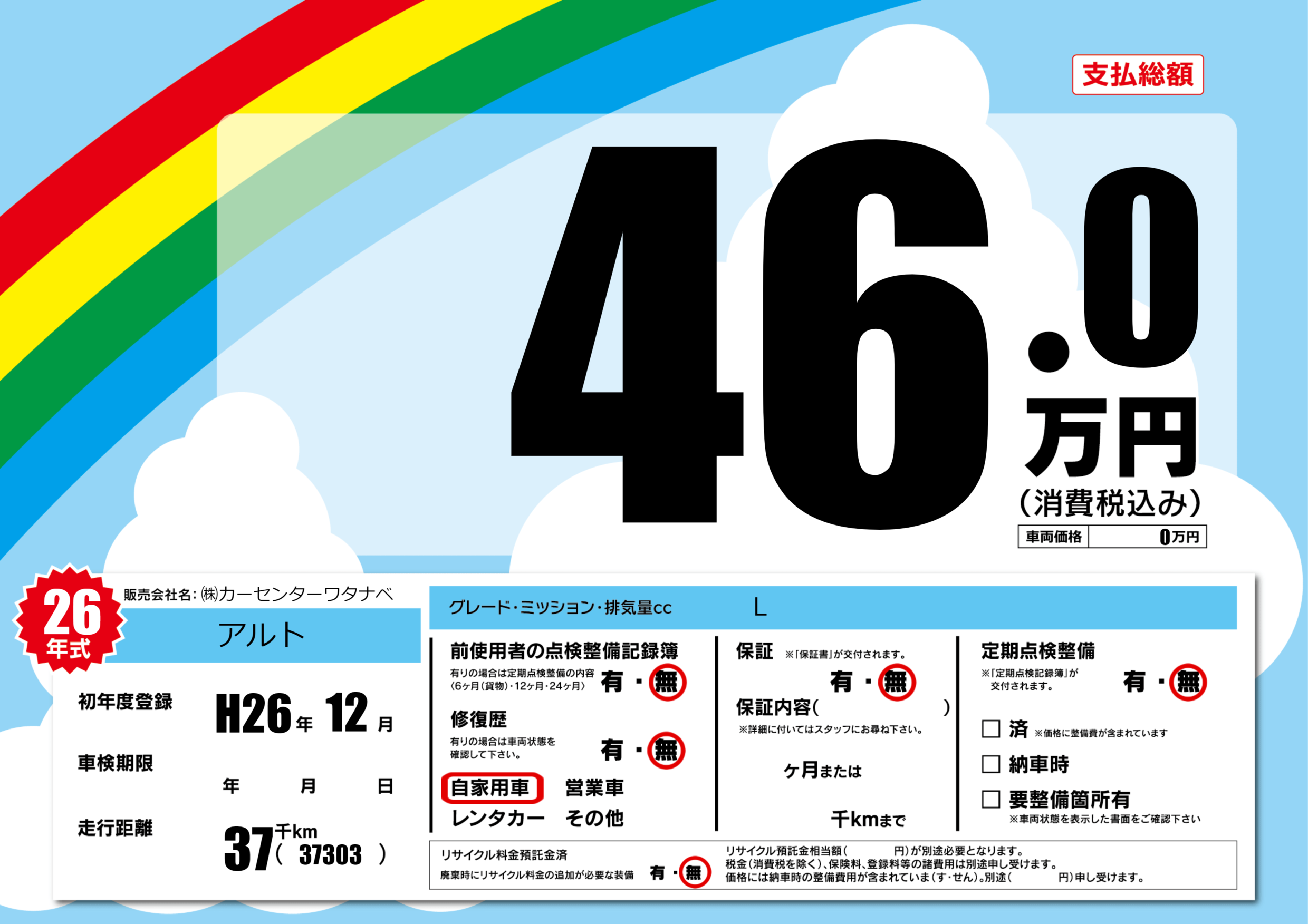 | 走行キロ | 3.7万km | 初年度登録 | H26年12月 |