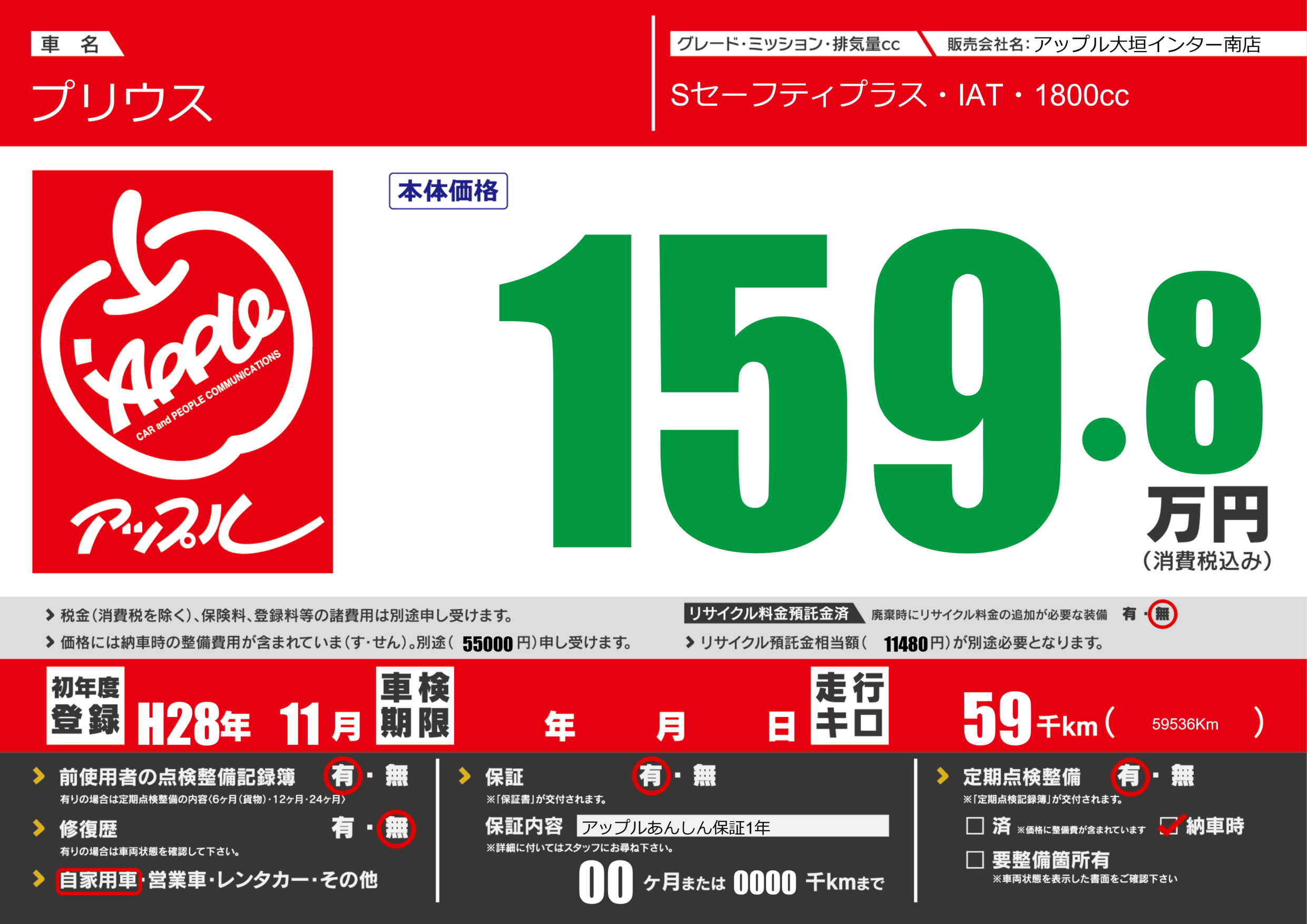 | 車名 | プリウス | グレード ミッション 排気量 |