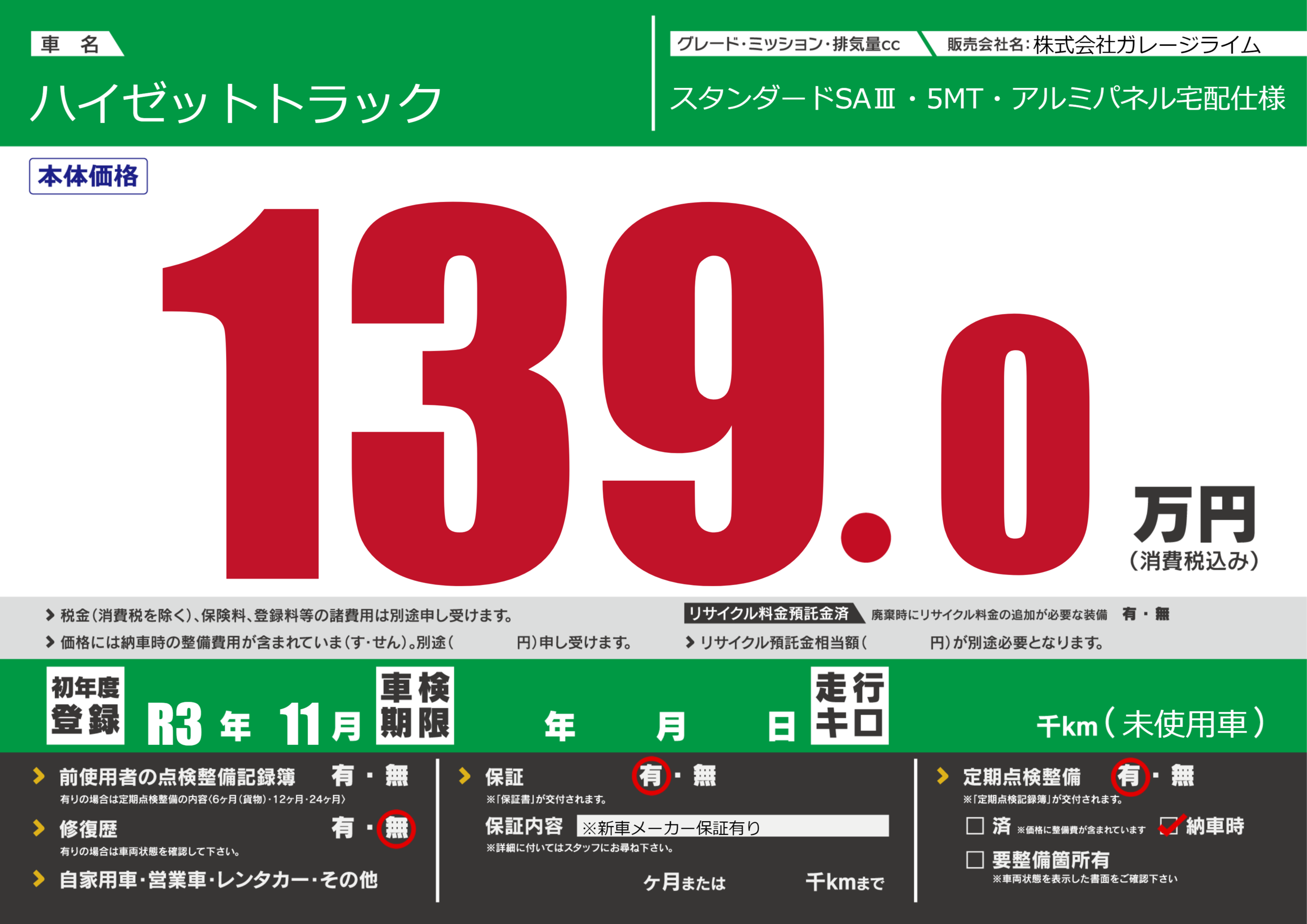 | 定期点検整備 | 定期点検整備あり 納車時あり | ||