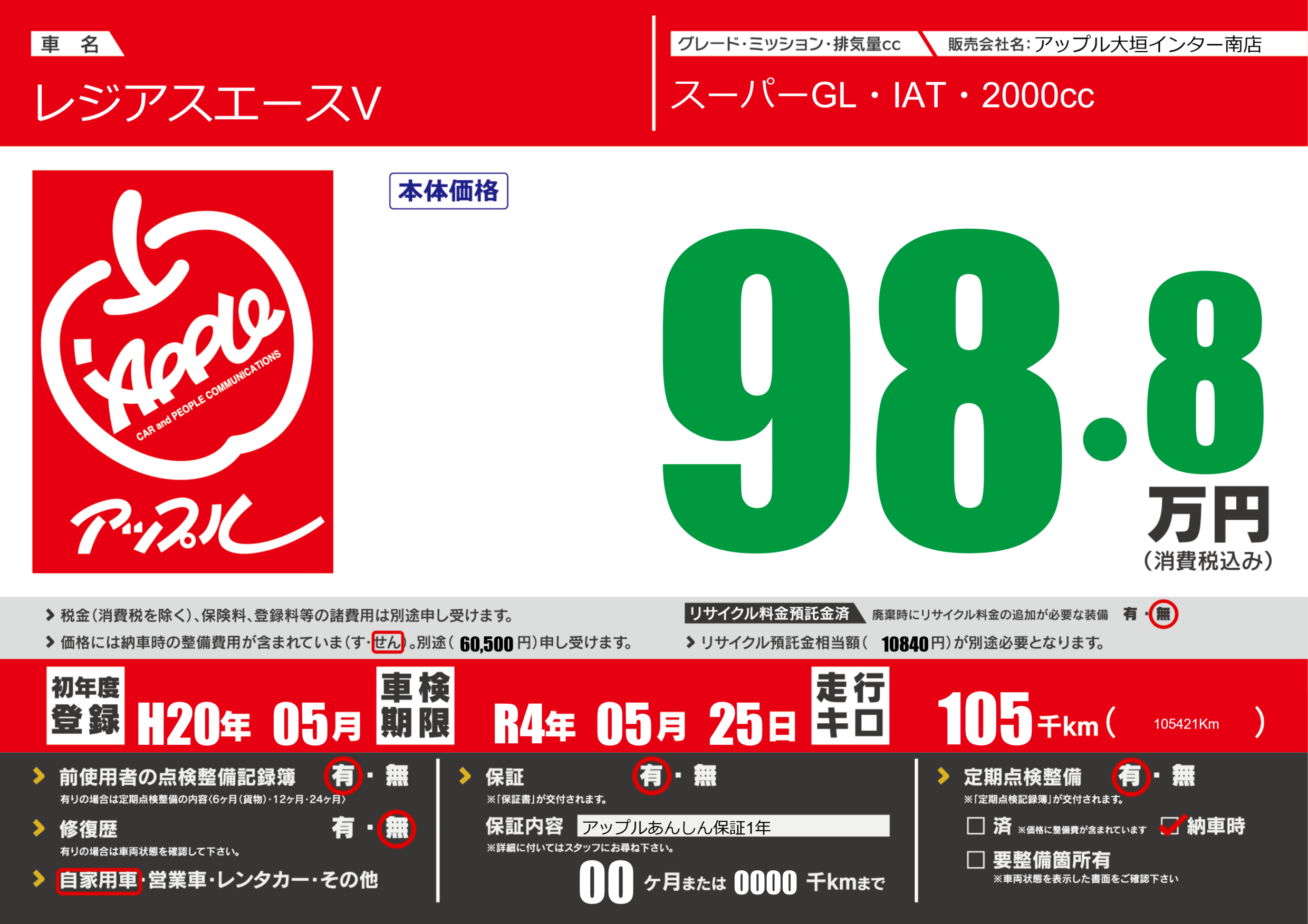 保証付き 保証内容(アップルあんしん保証1年) 00ヶ月または(0000)千kmまで |