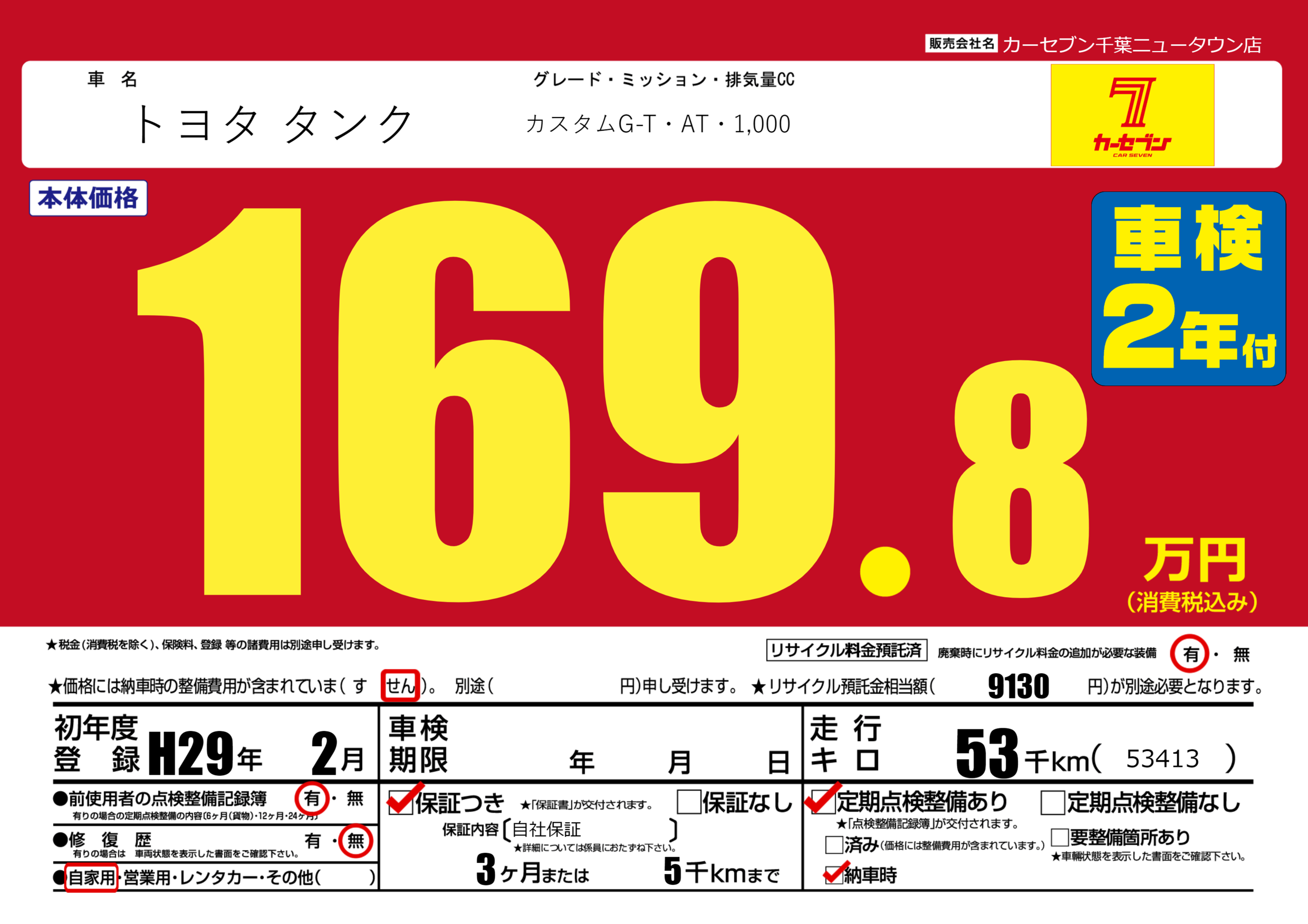 | 車名 | トヨタ タンク | グレード ミッション 排気量 |