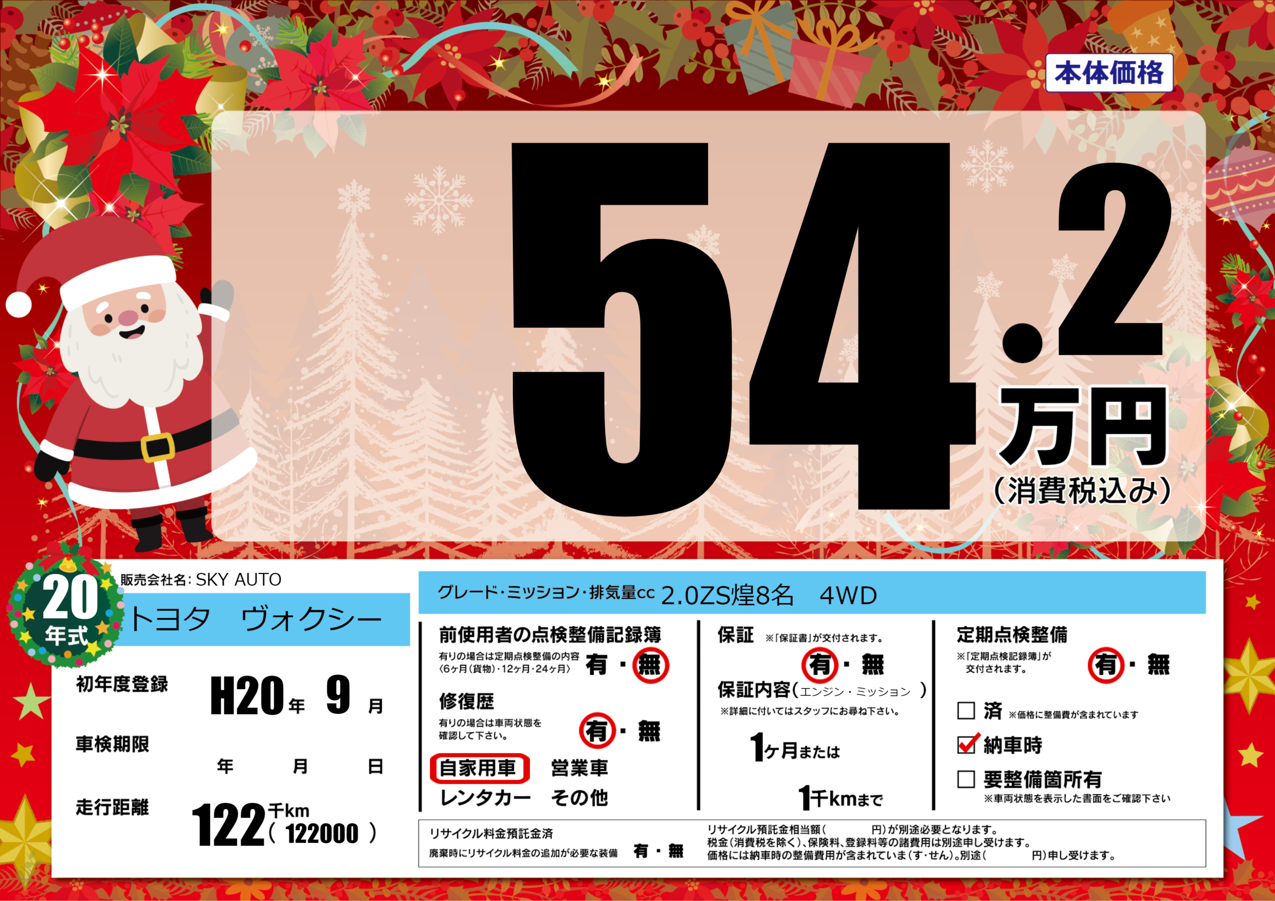 | 走行キロ | 12.2万km | 初年度登録 | H20年9月 |