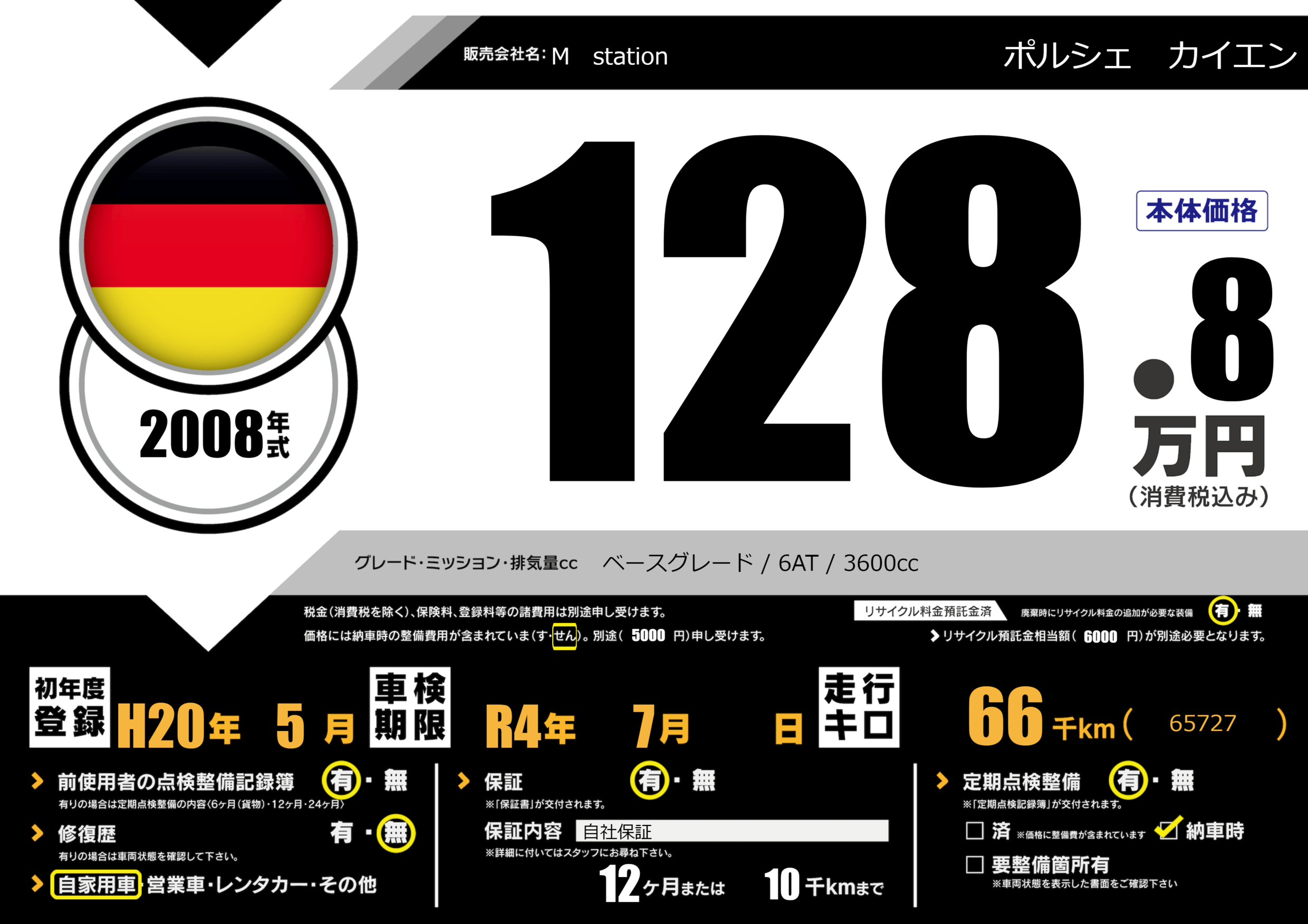 | 車名 | ポルシェ カイエン | グレード ミッション 排気量 |