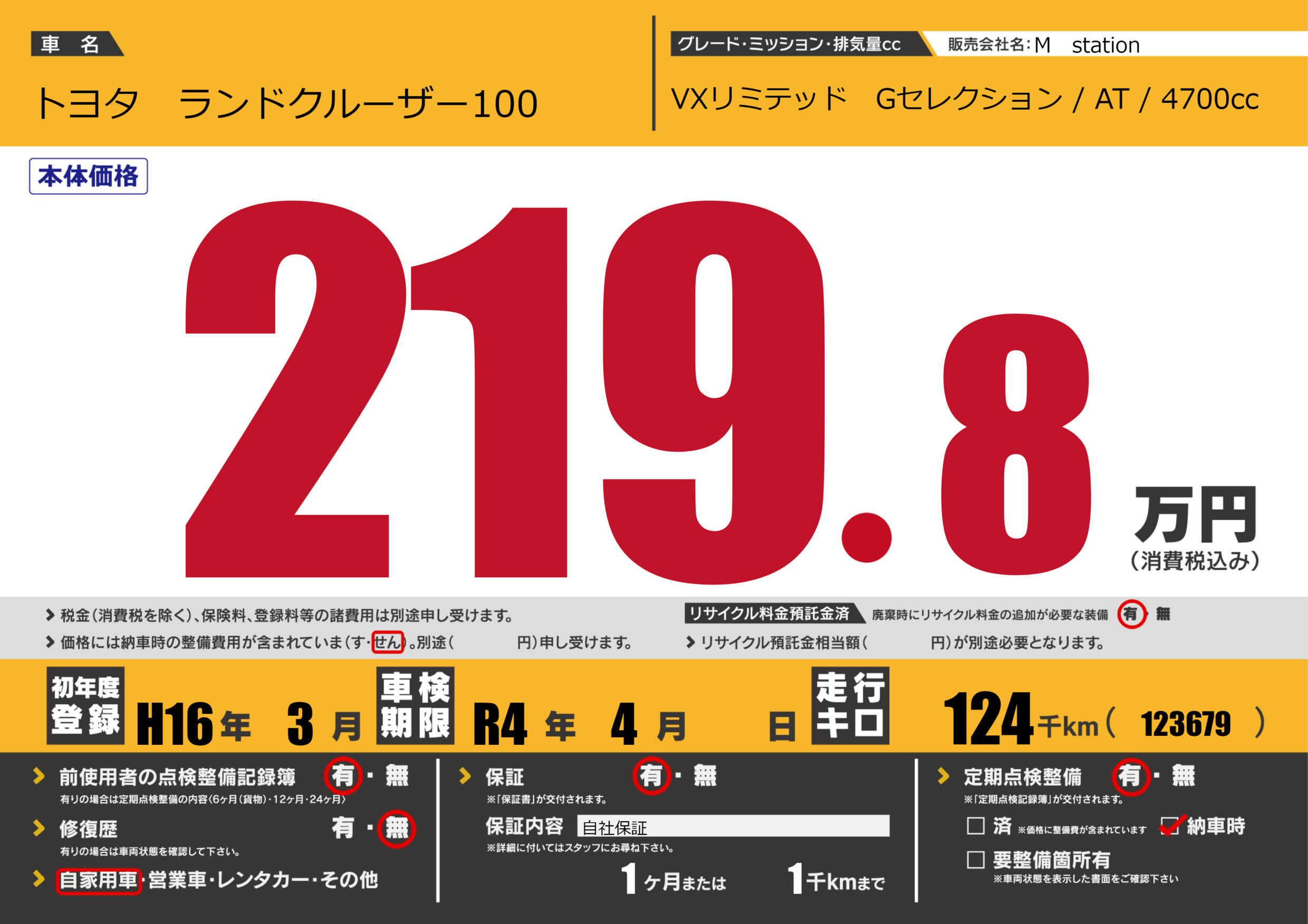 なし | 車検制限 | R4年4月---月 |