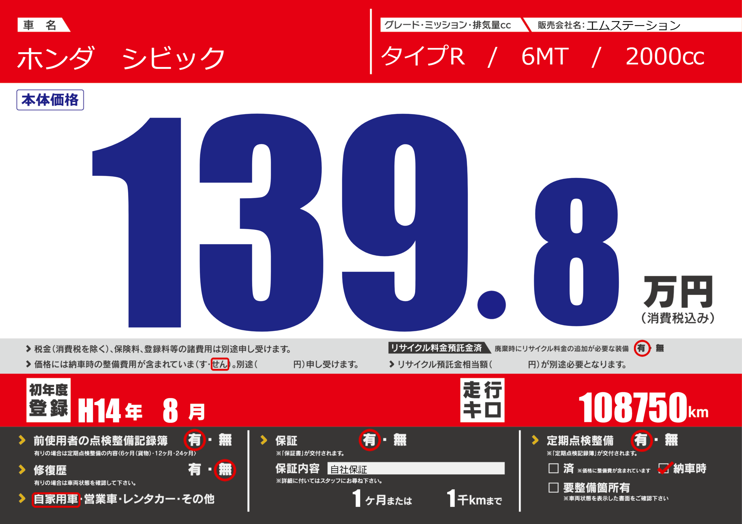 | 走行キロ | 10875万km | 初年度登録 | H14年8月 |