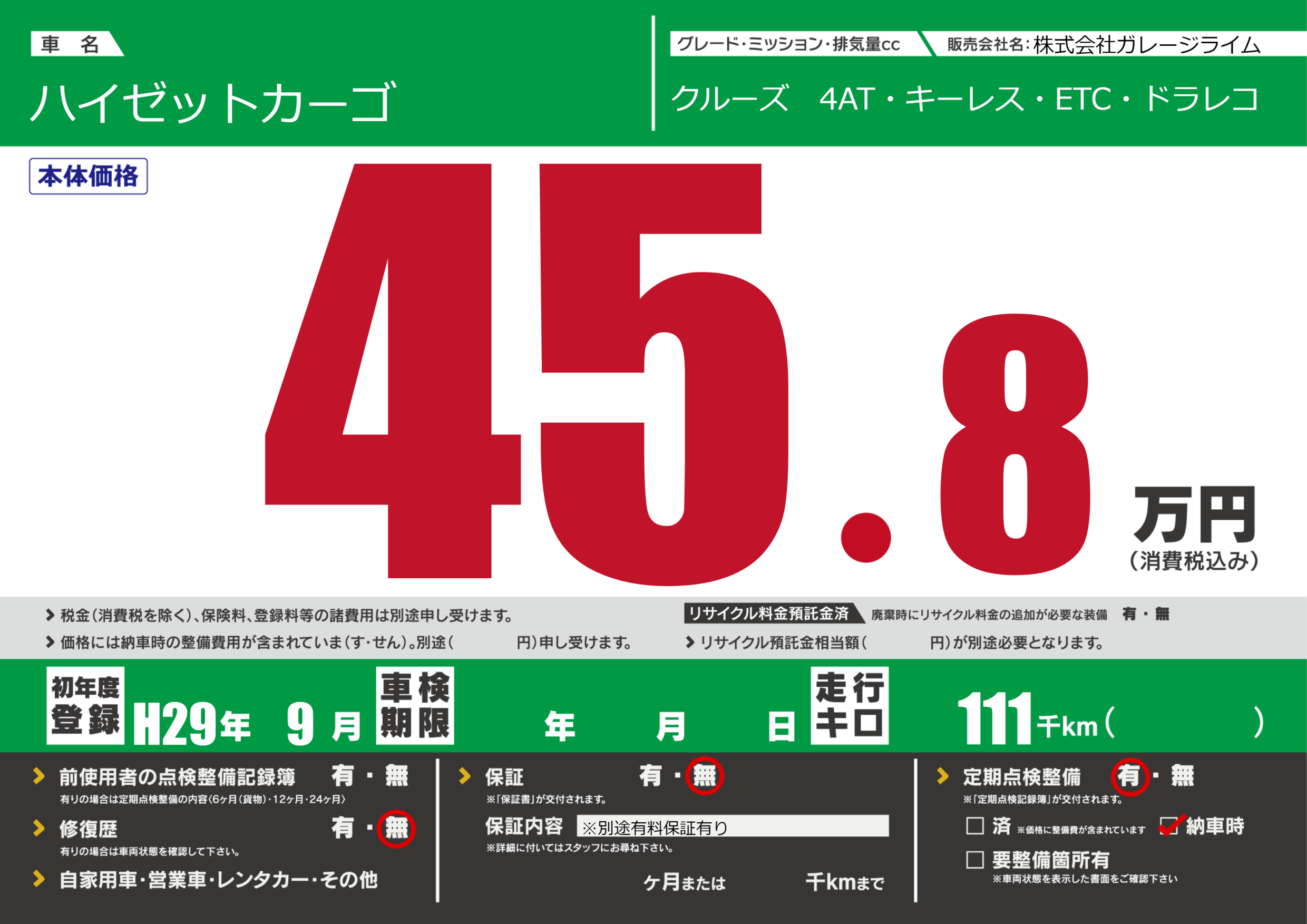 | 車名 | ハイゼットカーゴ | グレード ミッション 排気量 |