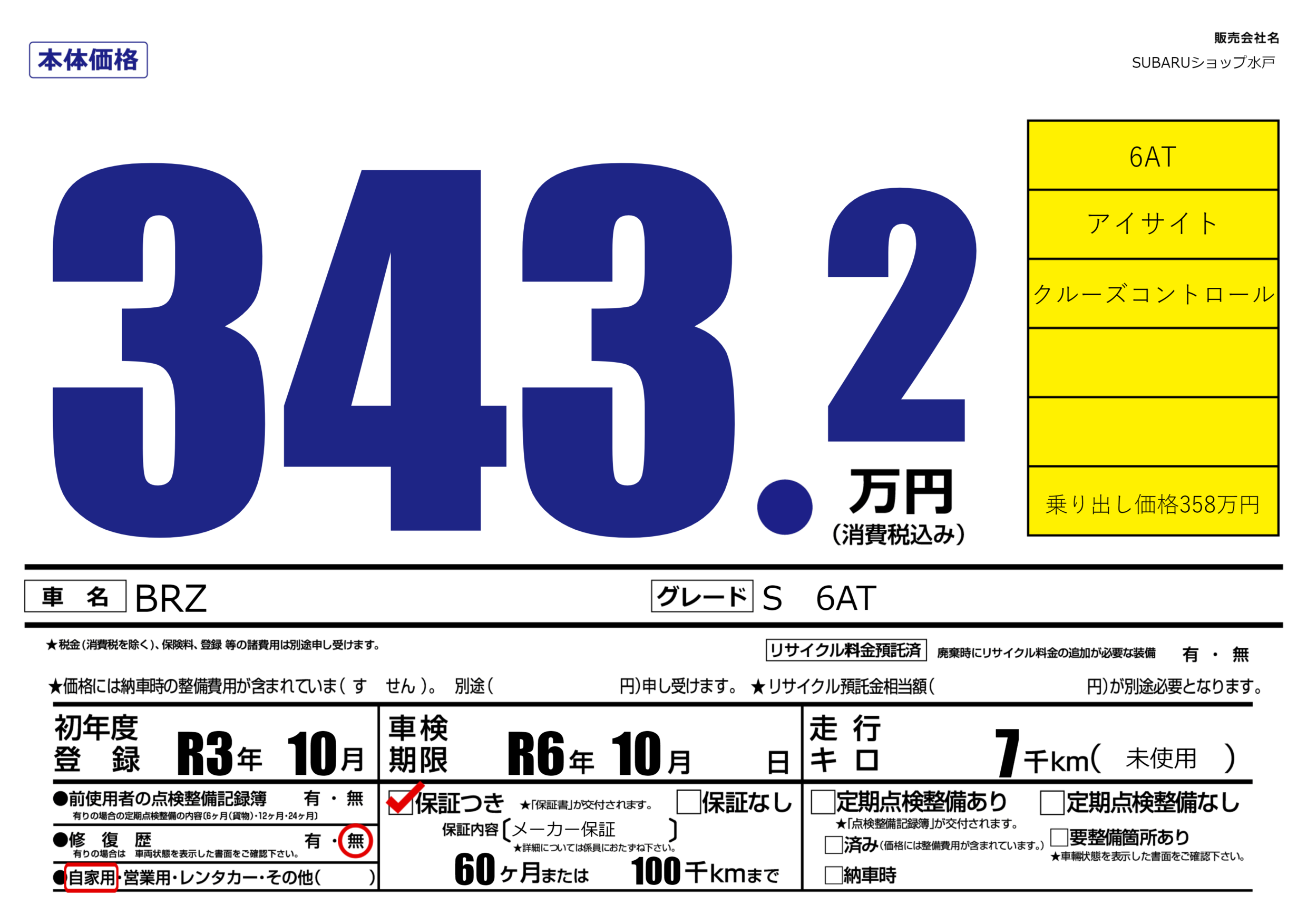 | 車名 | BRZ | グレード ミッション 排気量 |