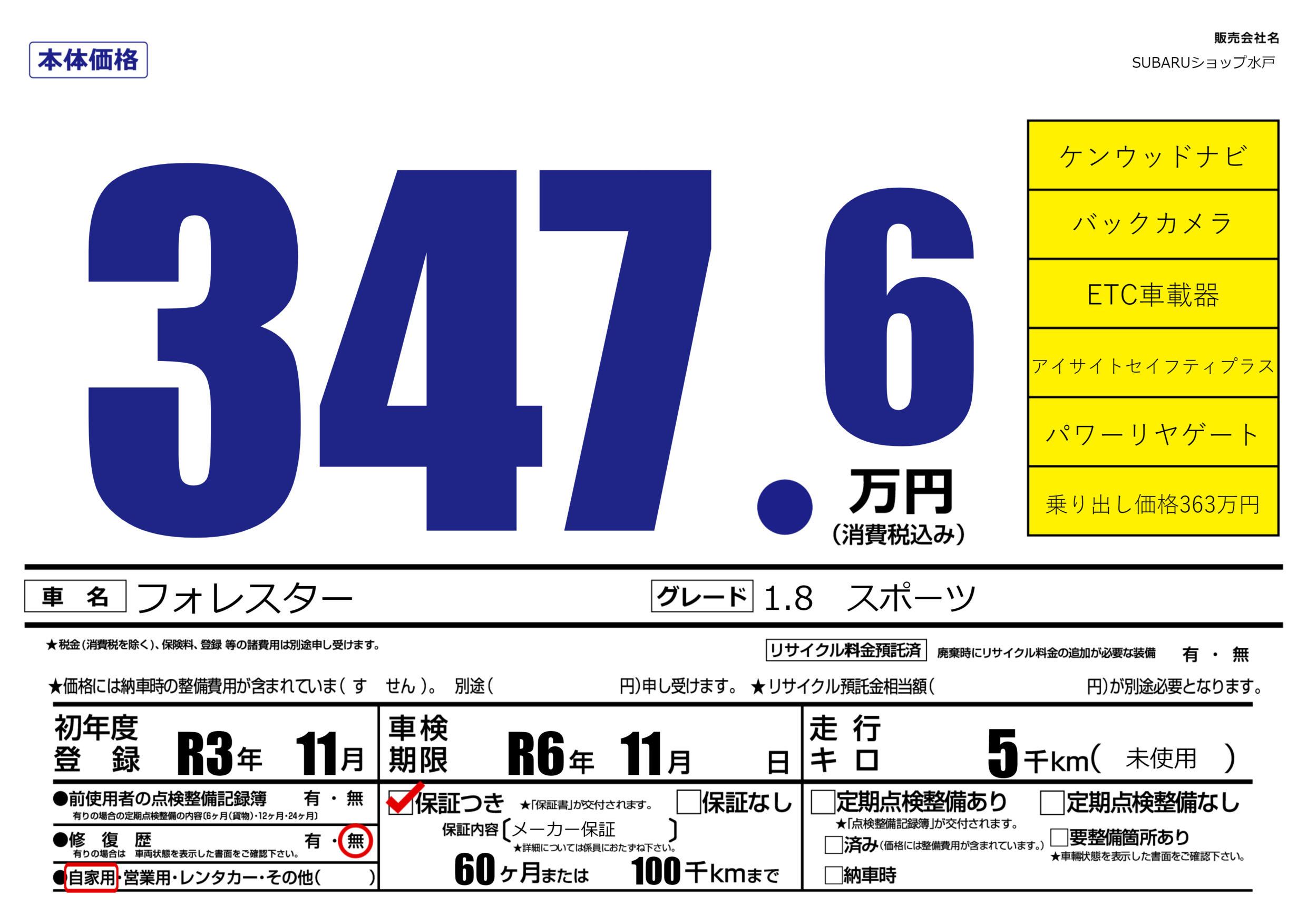 | 車名 | フォレスター | グレード ミッション 排気量 |