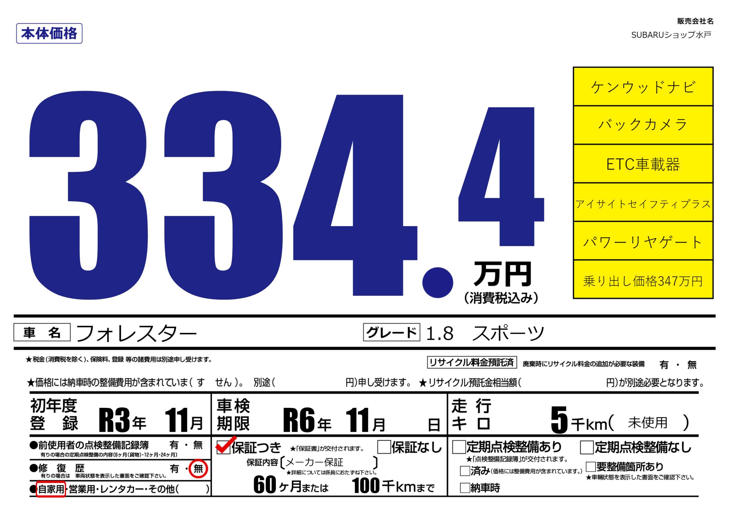 | 車名 | フォレスター | グレード ミッション 排気量 |