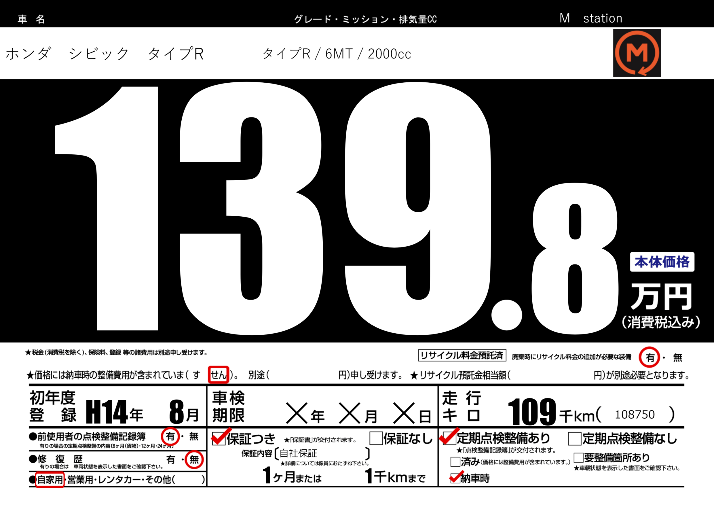 | 車名 | ホンダ シビック タイプR | グレード ミッション 排気量 |