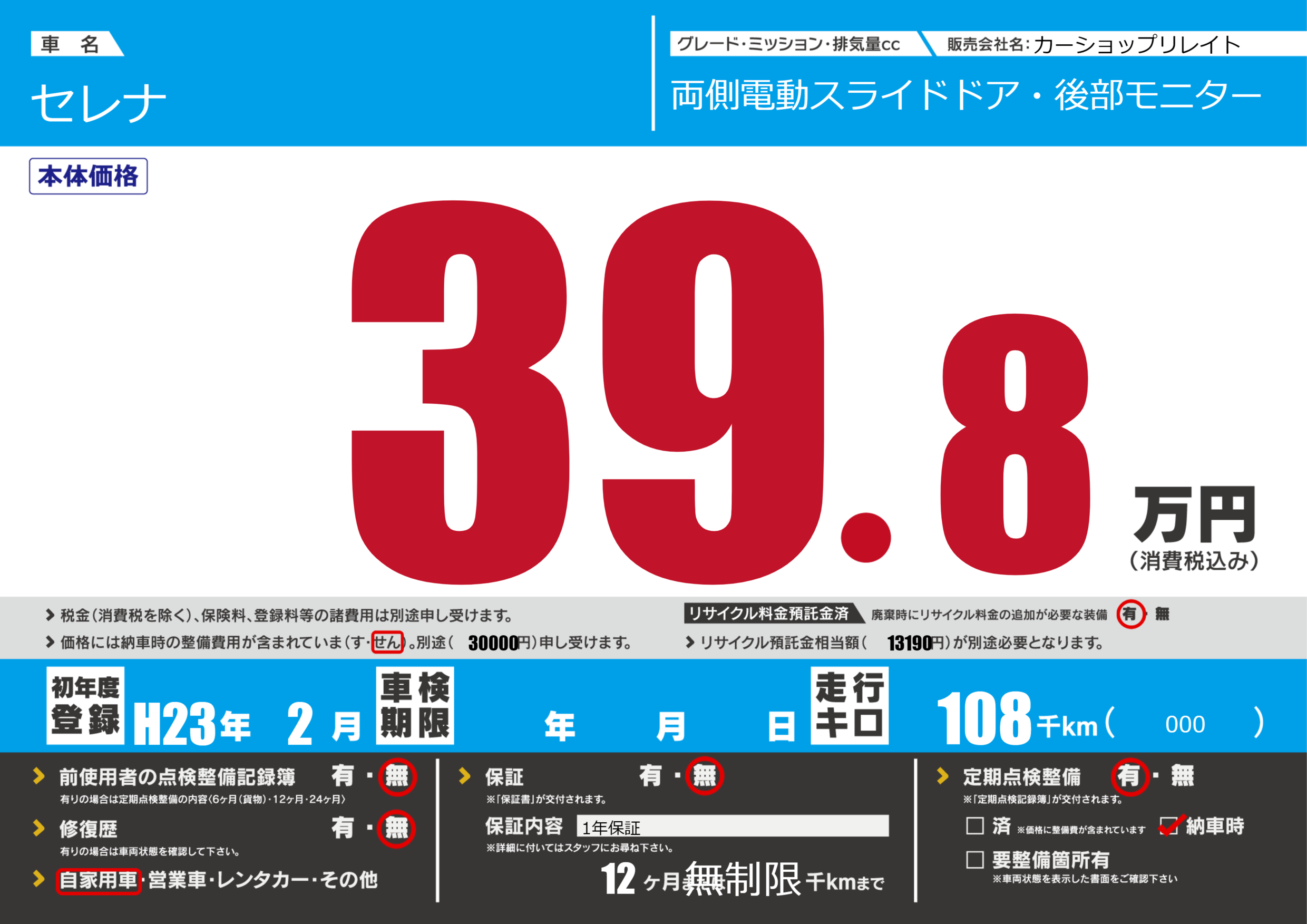 | 定期点検整備 | 定期点検整備あり 納車時あり | ||