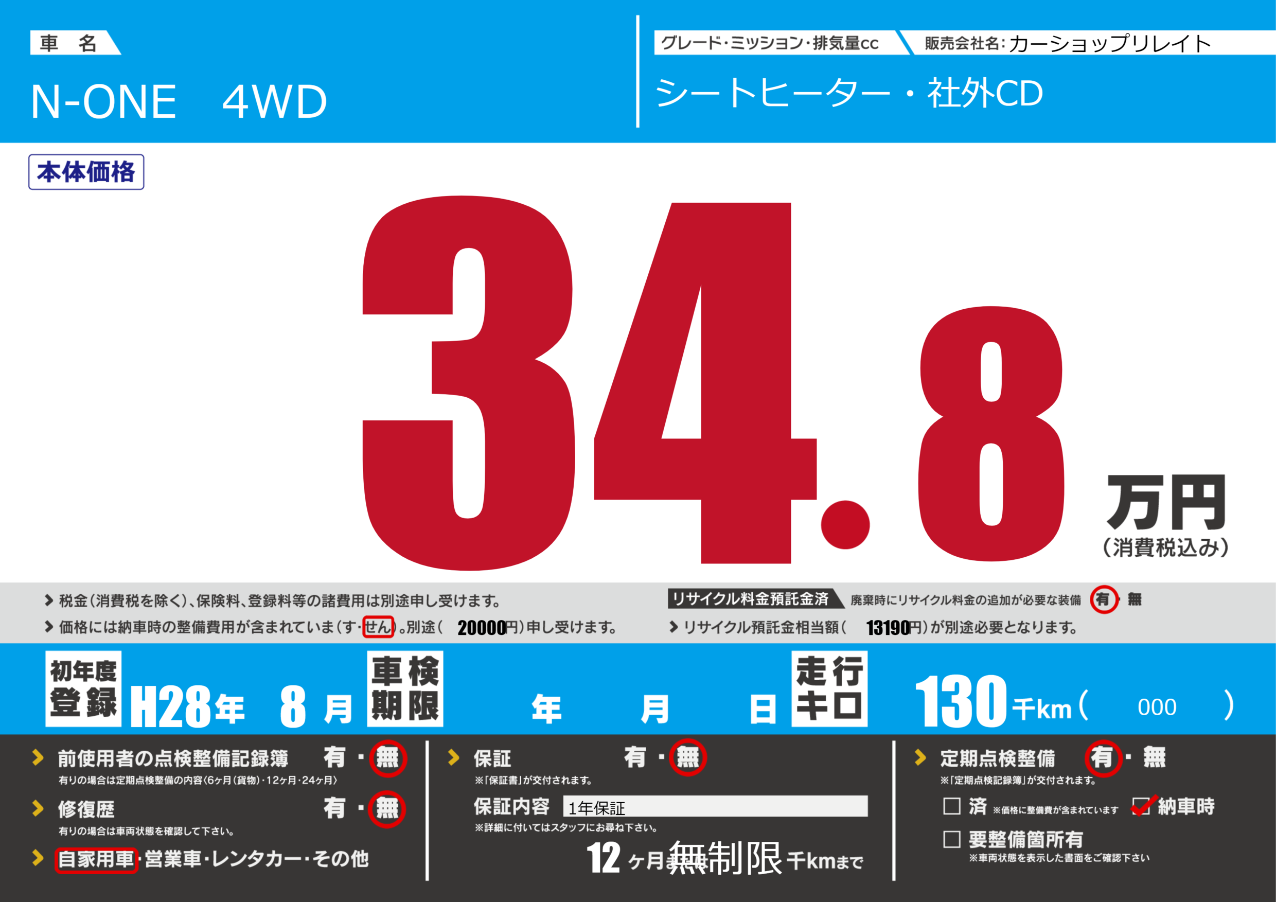 | 車名 | N-ONE 4WD | グレード ミッション 排気量 |