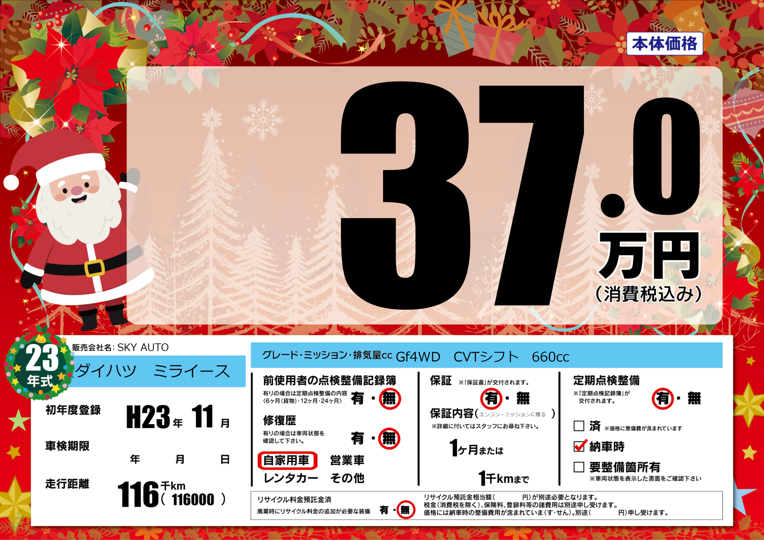 | 走行キロ | 11.6万km | 初年度登録 | H23年11月 |