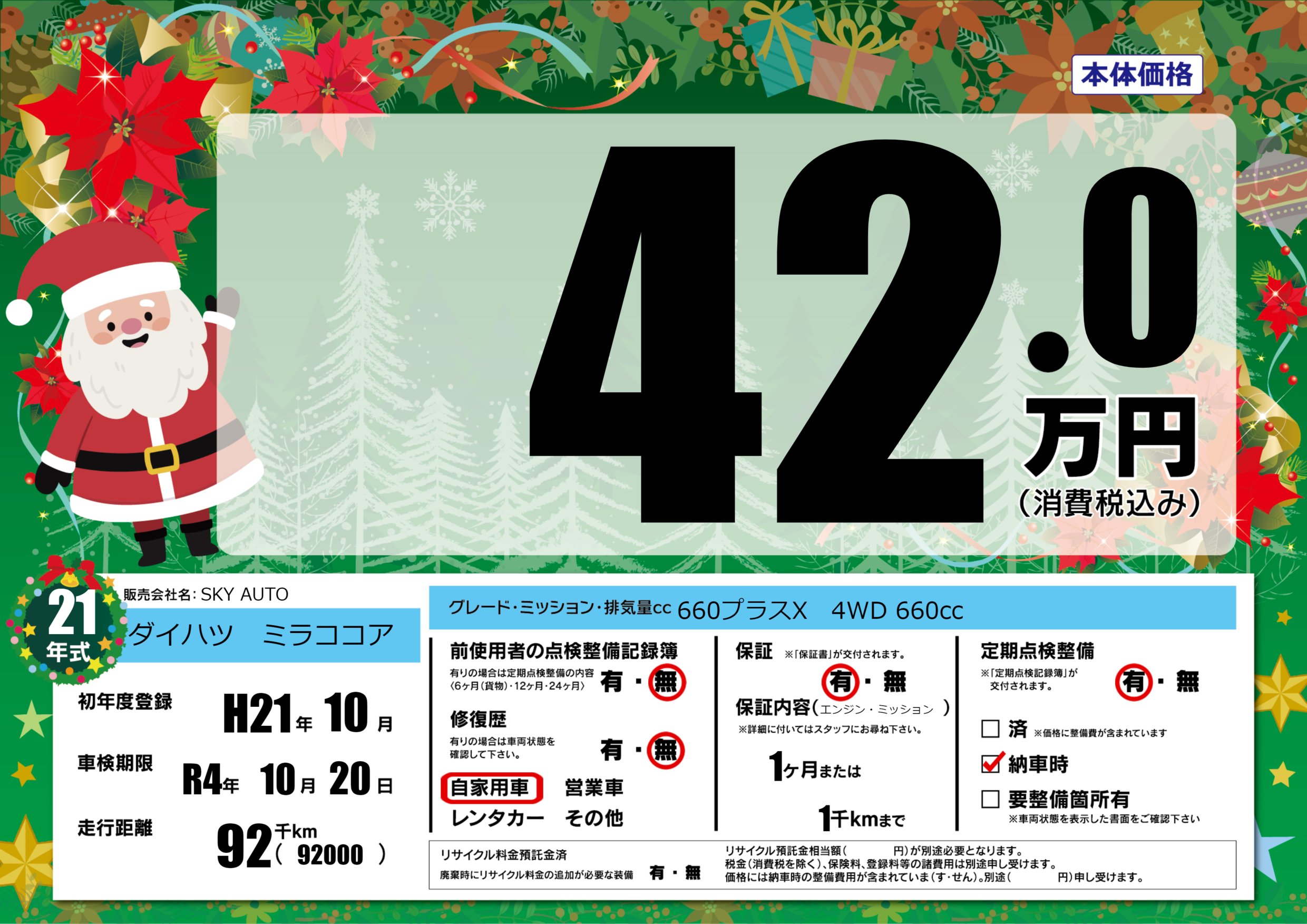 | 車名 | ダイハツ ミラココア | グレード ミッション 排気量 |