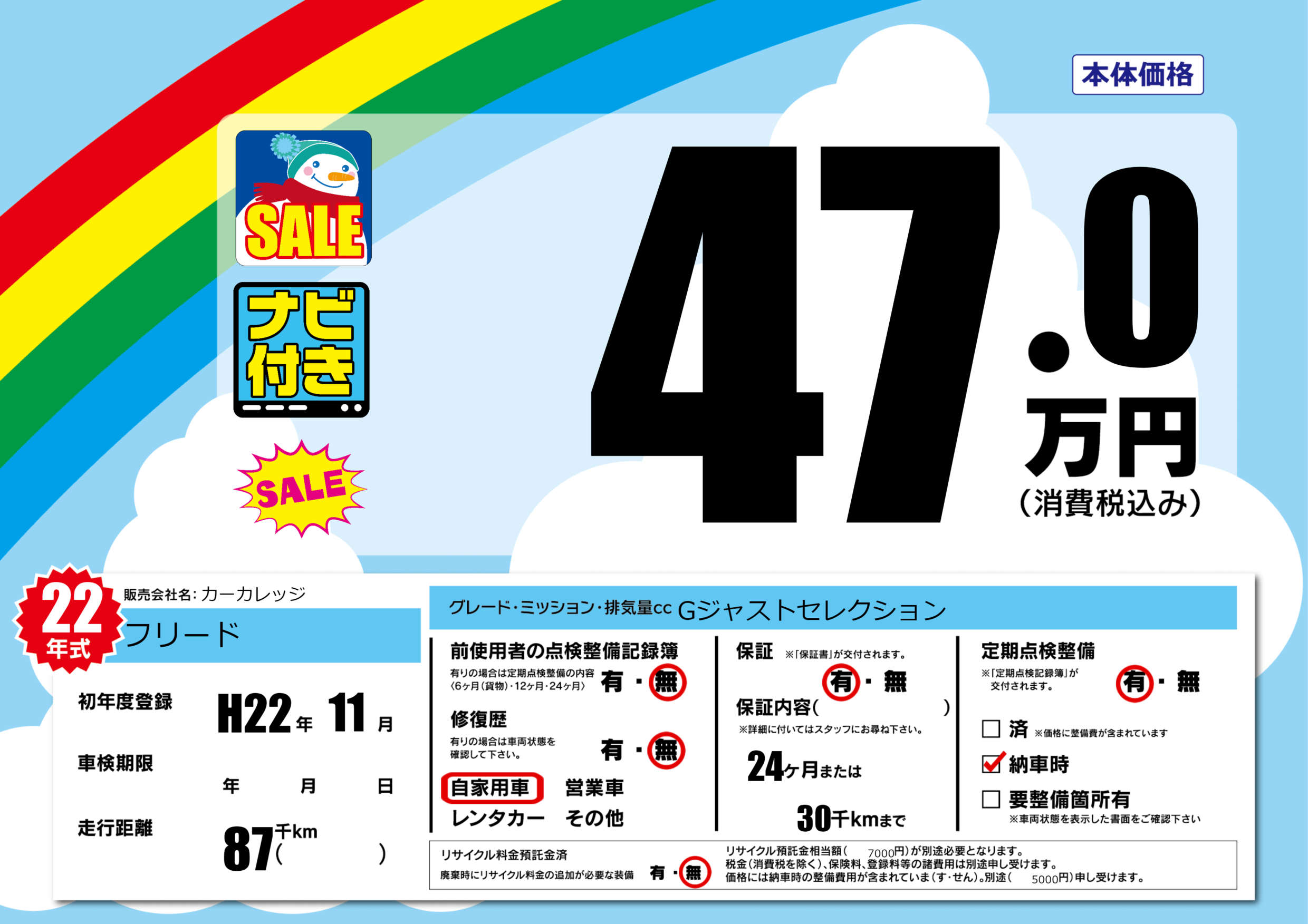 | 定期点検整備 | 定期点検整備あり 納車時あり | ||