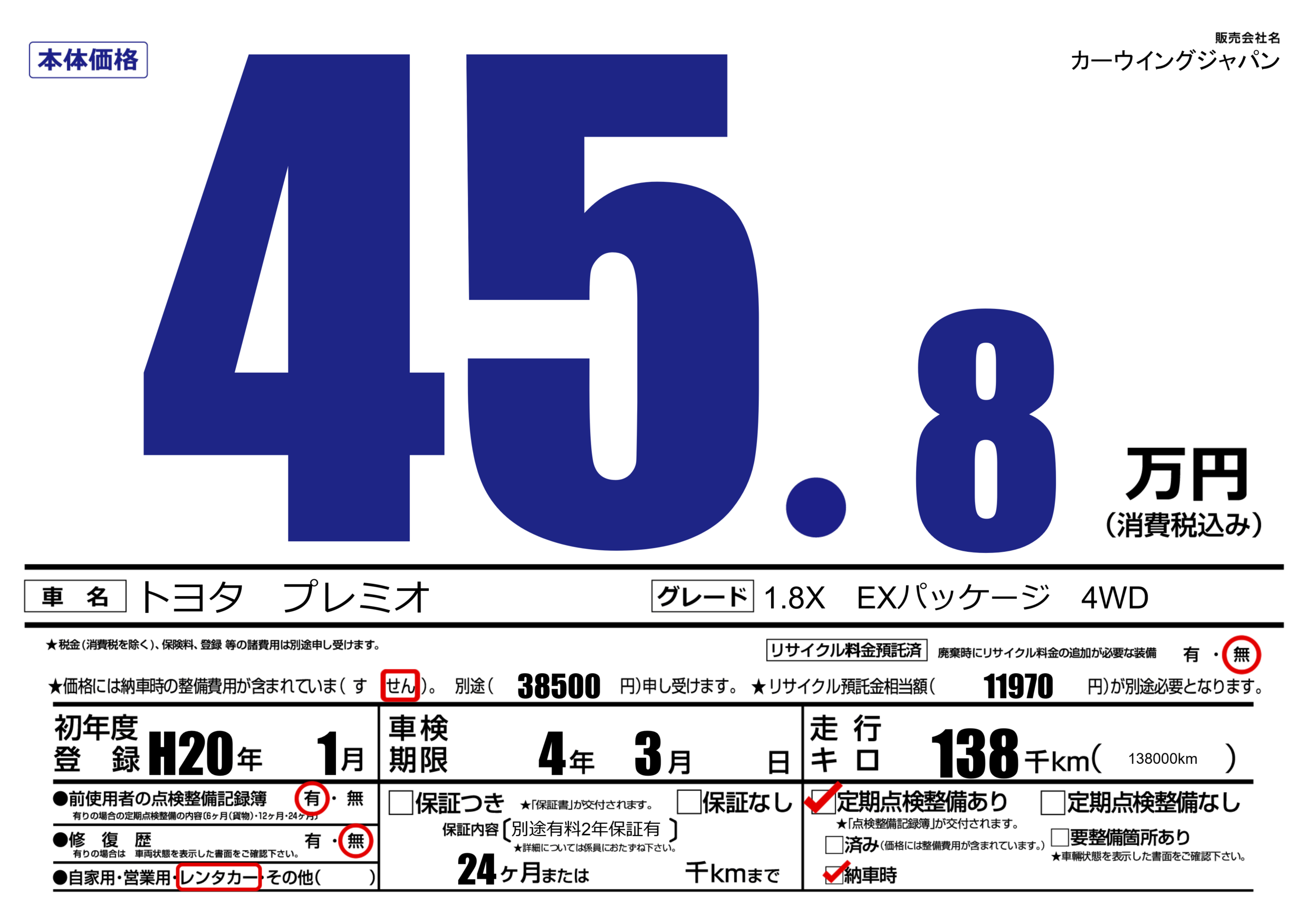 | 車名 | トヨタ プレミオ | グレード ミッション 排気量 |