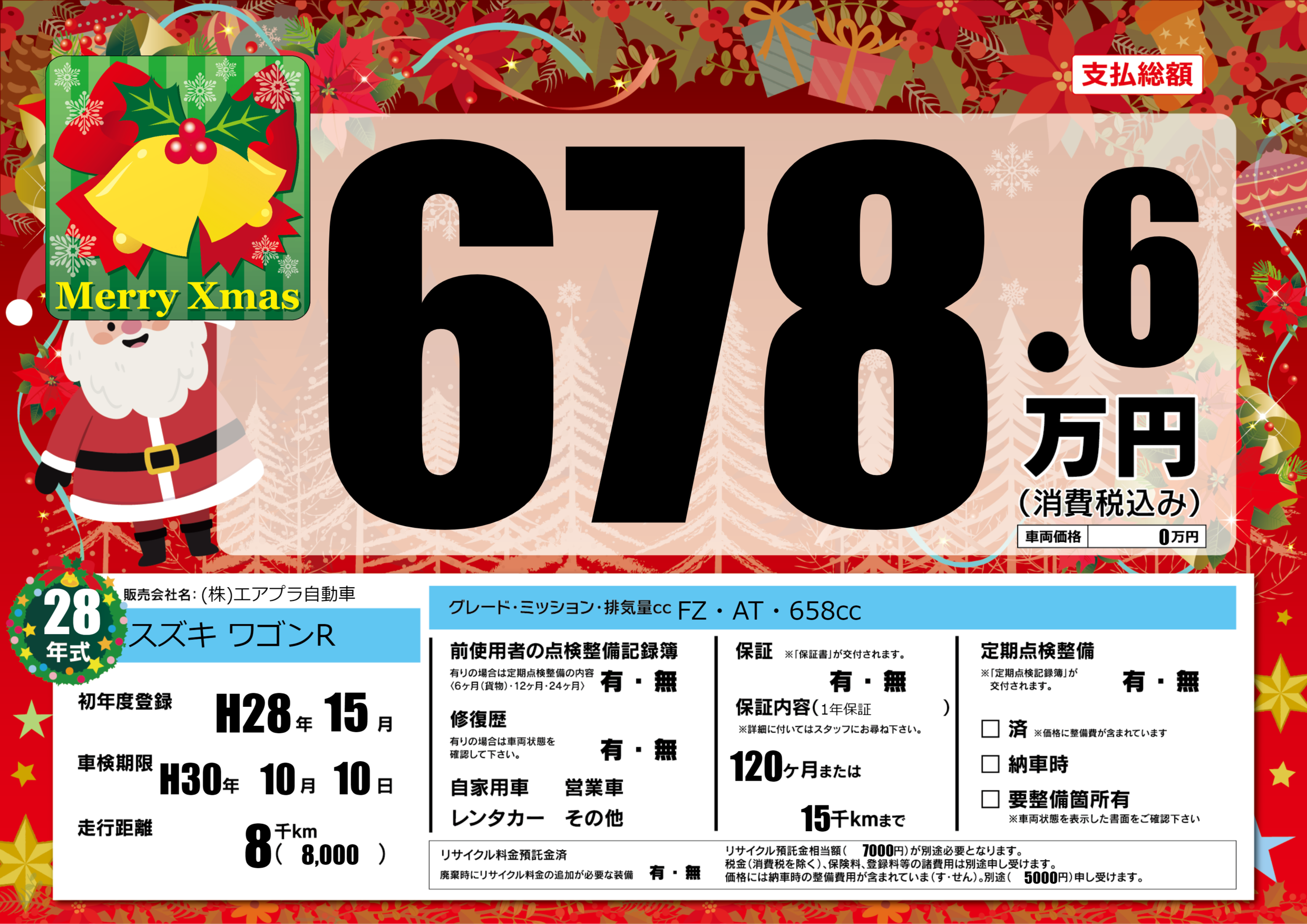 | 走行キロ | 0.8万km | 初年度登録 | H28年15月 |