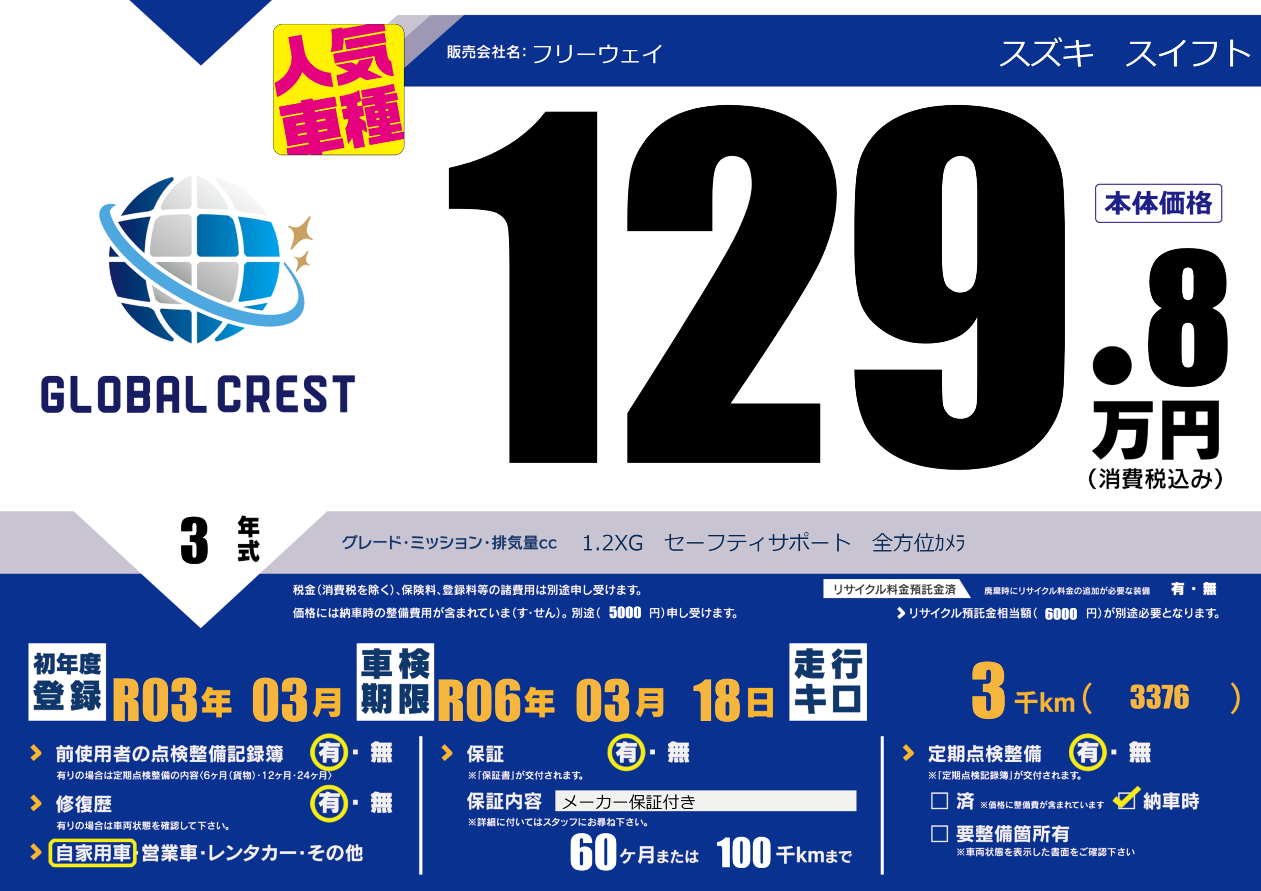 | 走行キロ | 0.3万km | 初年度登録 | R03年03月 |