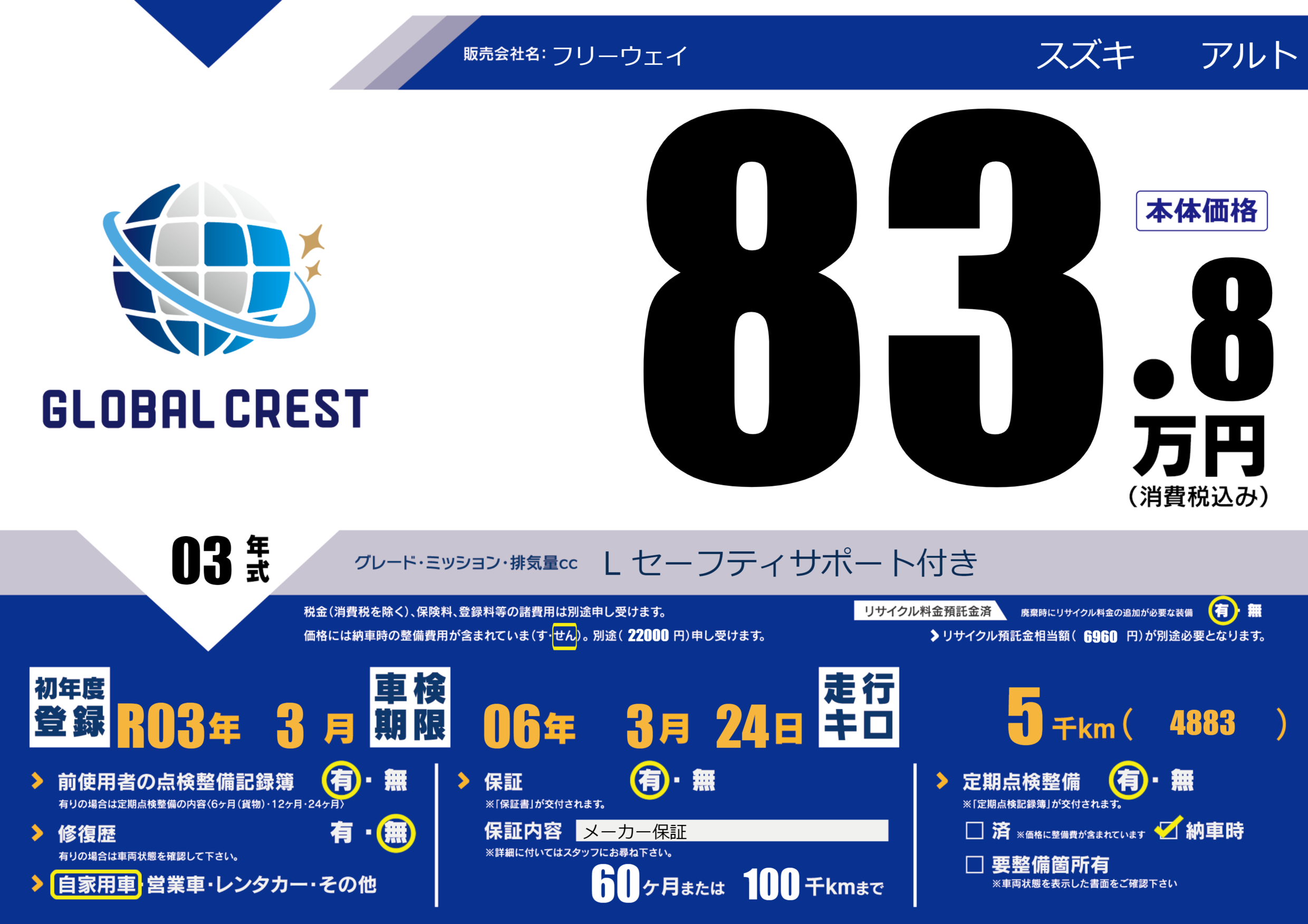 保証付き 保証内容(メーカー保証) 60ヶ月または(100)千kmまで |