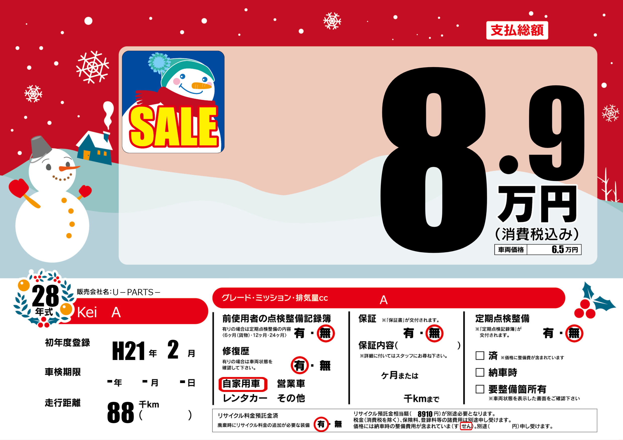 | 走行キロ | 8.8万km | 初年度登録 | H21年2月 |