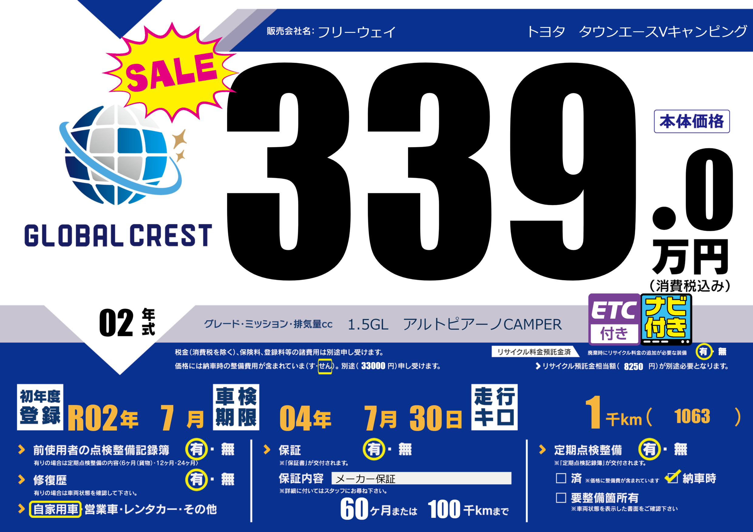 | 車名 | トヨタ タウンエースVキャンピング | グレード ミッション 排気量 |