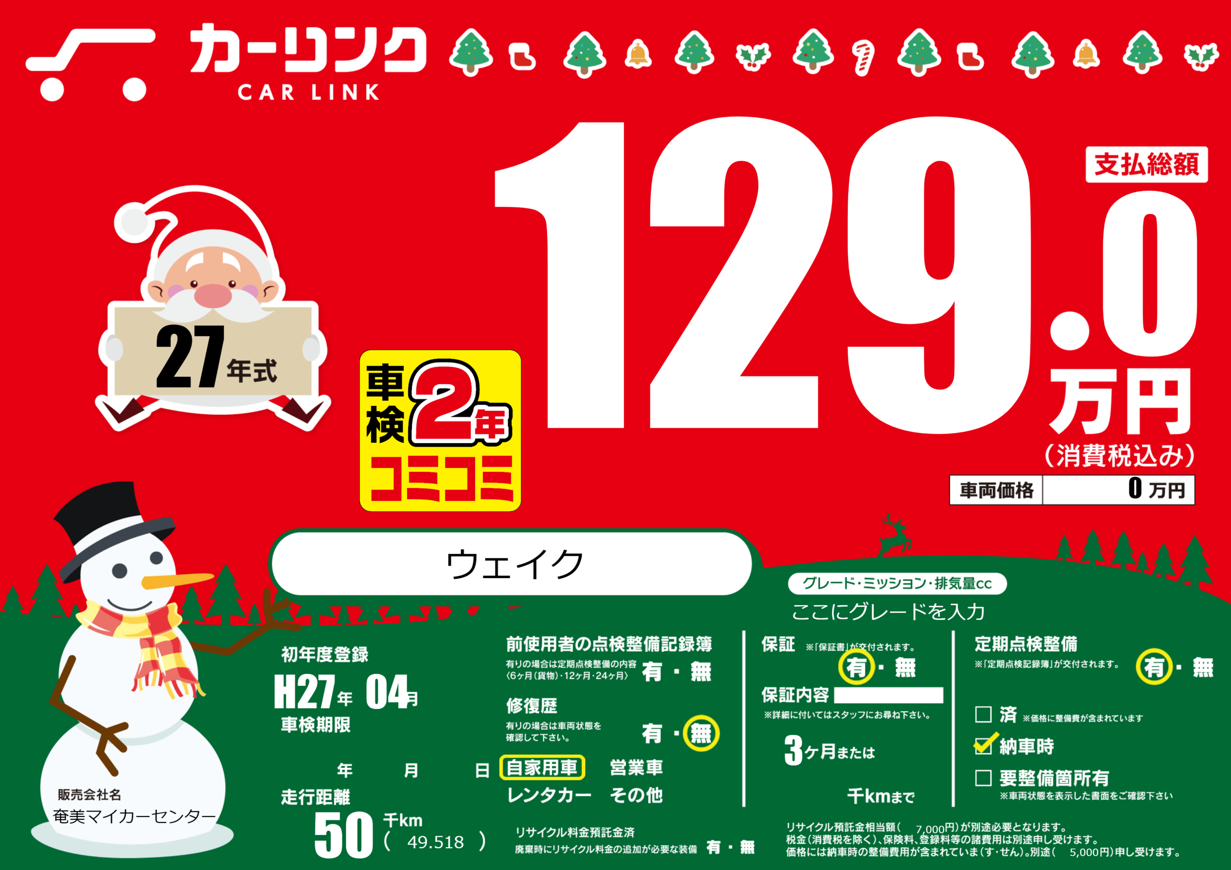 | 走行キロ | 5万km | 初年度登録 | H27年04月 |