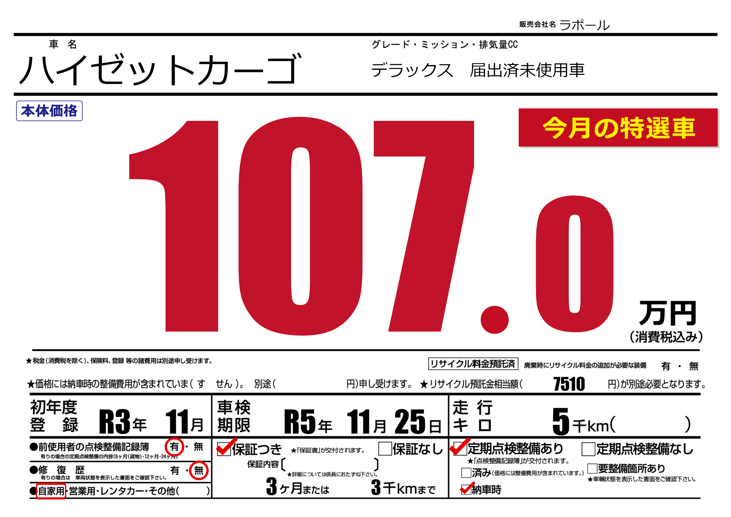 | 走行キロ | 0.5万km | 初年度登録 | R3年11月 |