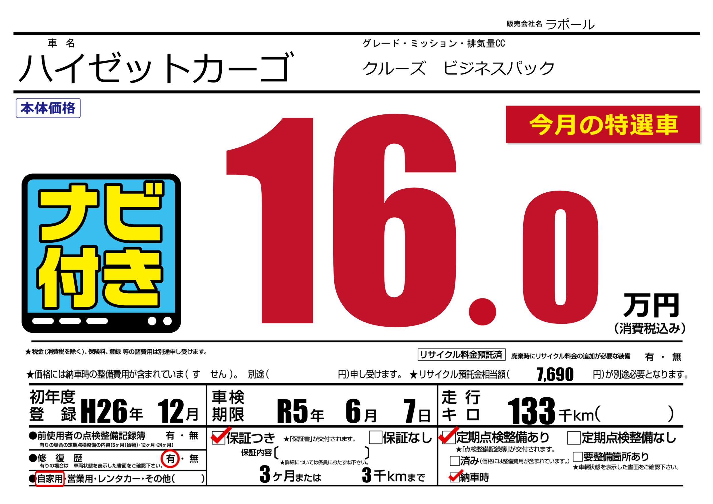 | 車名 | ハイゼットカーゴ | グレード ミッション 排気量 |